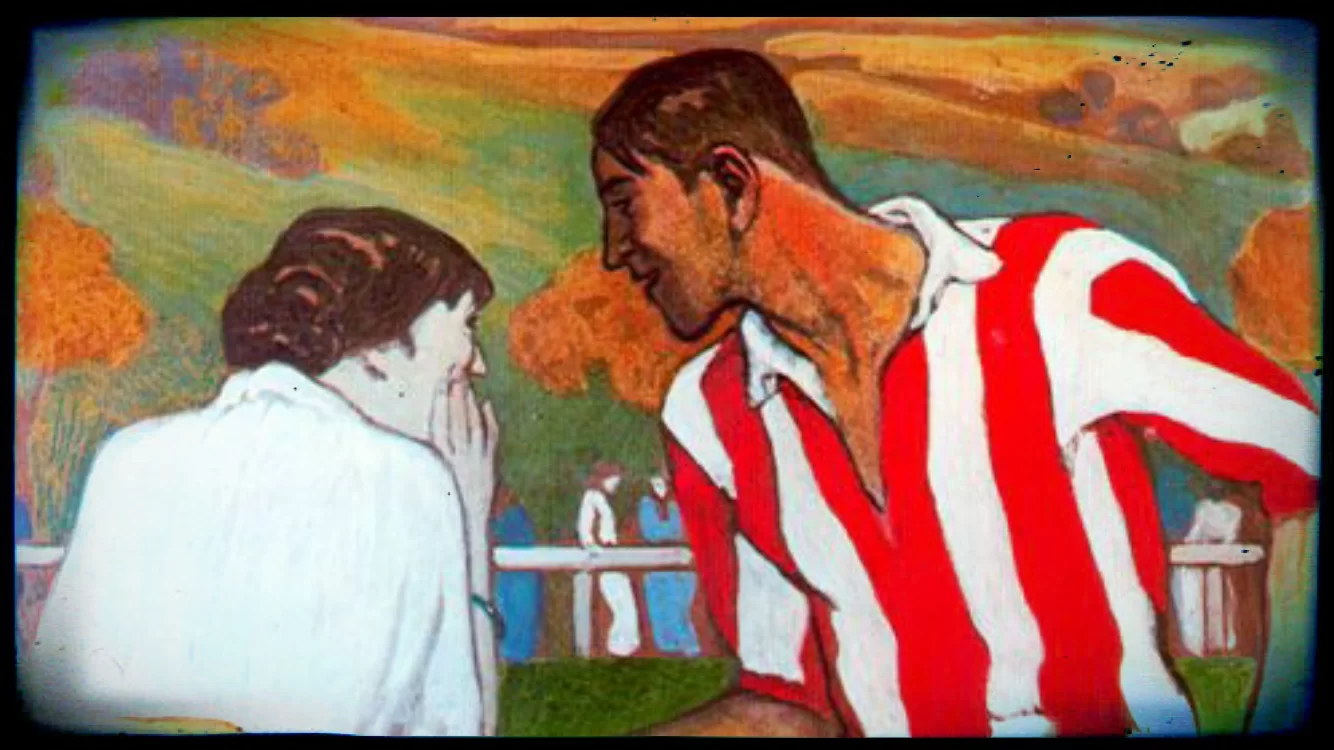 Osservando il protagonista maschile, notiamo che indossa una maglia a strisce verticali bianco-rosse e pantaloncini azzurri, una divisa che oggi pare molto simile a quella dell’Atletico di Madrid (che all’epoca era una filiale dell’Athletic Club di Bilbao fondata nel 1903 per i giovani baschi emigrati nella capitale per studio o lavoro).