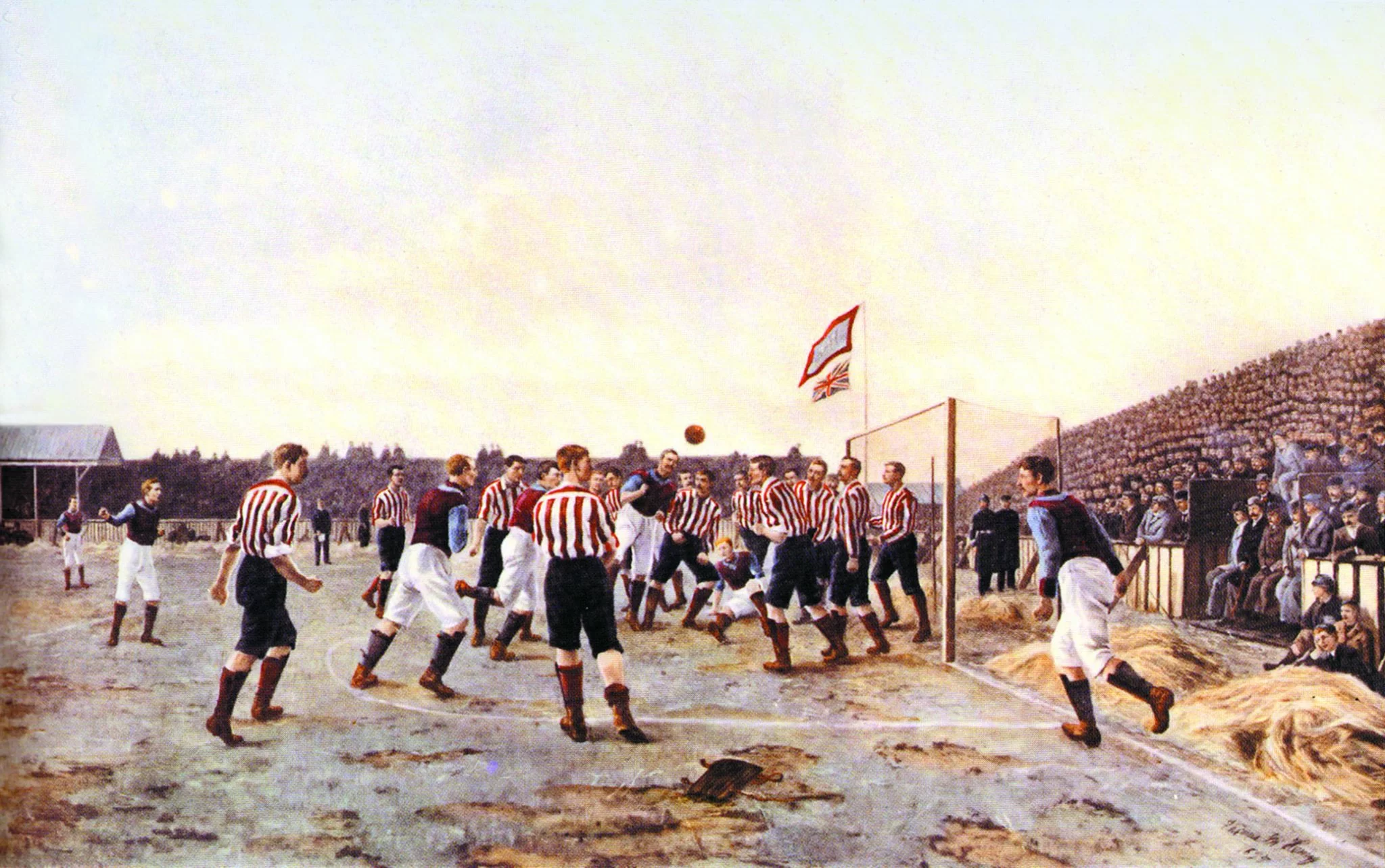 Il quadro fu incaricato a Hemy da un esponente importante del Sunderland per festeggiare la vittoria del terzo titolo di Football League. I dirigenti del club sono raffigurati seduti in una zona degli spalti situata proprio dietro la porta; questa infelice ubicazione è dovuta all’esigenza di farli rientrare nel quadro: in realtà videro l’incontro dalla tribuna coperta che vediamo in fondo a sinistra. Certo, una dirigenza facoltosa e un pubblico numeroso erano fattori importanti nelle fortune di un club, ma i veri protagonisti delle sue vittorie erano i calciatori: erano questi, infatti, che con le loro imprese raggiungevano lo status di eroi per la città che li seguiva con passione. Eroi in cui i tifosi si identificavano anche perché erano operai come loro; infatti, sebbene il professionismo fosse legale in Inghilterra dal 1885, i giocatori preferivano conciliare l’attività calcistica con un lavoro sicuro in fabbrica o in un pub perché la loro carriera era breve: nel migliore dei casi terminava poco dopo i trent’anni, nel peggiore poteva essere stroncata prima da un infortunio.