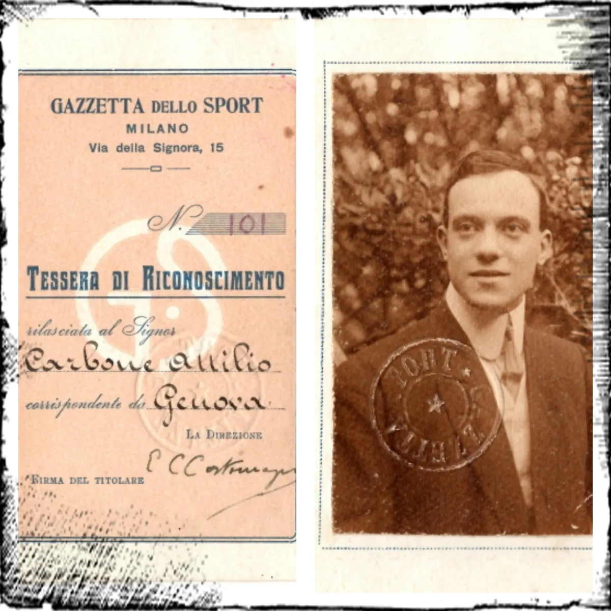 Tra i cimeli di natura sportiva, forse meno appariscente di altri ma assolutamente rimarchevole, ecco la tessera di riconoscimento n. 101 “valevole pel 1911”, rilasciata dalla Gazzetta dello Sport al Signor Carbone Attilio, “corrispondente da Genova”, a firma dell’allora Direttore Eugenio Camillo Costamagna.
