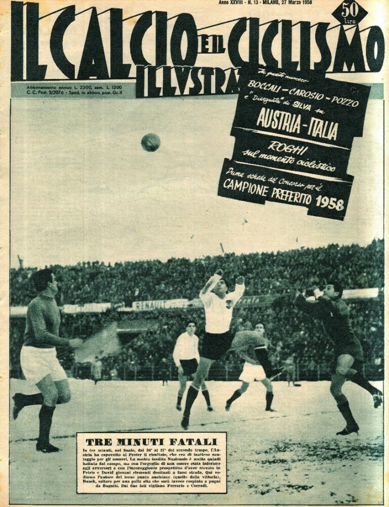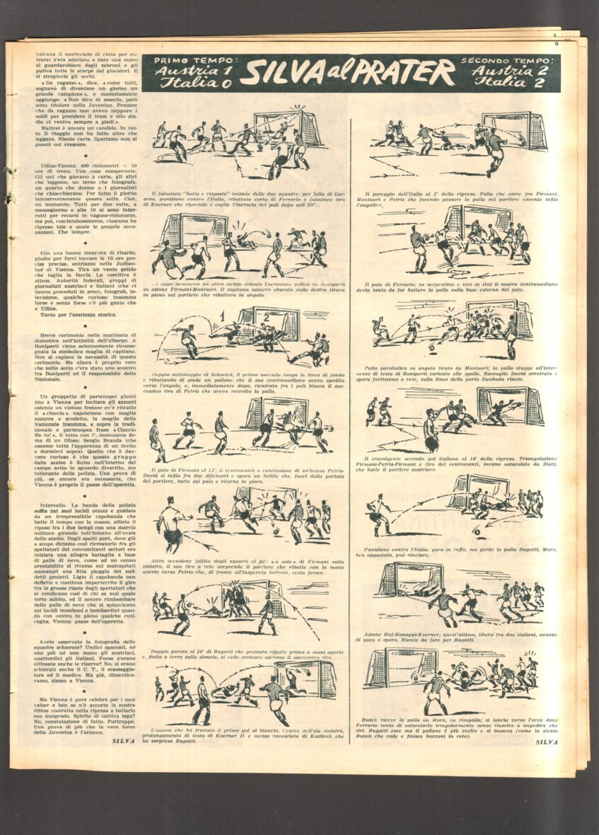 “Il Calcio e il Ciclismo Illustrato” well details that match by headlined on the front page “Three fatal minutes” those that cost Italy an undeserved 3-2 defeat. In addition to the bitterness of the defeat, the match was played in conditions on the edge, or perhaps even beyond, in a field totally covered by snow and with an intense cold to which, however, sixty thousand spectators were happy to submit. A match of the past immortalized by the press in detail and also through the “historic pencil” of Carmelo Silva, as well as the topical moment in which Boniperti presented the Italian pennant to the Austrian captain Hanappi.