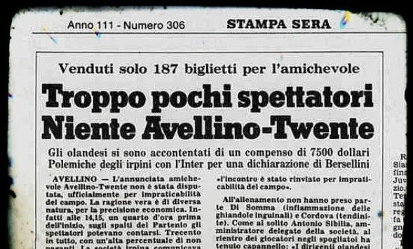 GLIEROIDELCALCIO.COM – “L’annunciata amichevole Avellino-Twente non è stata disputata, ufficialmente per impraticabilità del campo. La ragione vera è di diversa natura, per la precisione economica. Infatti alle 14,15, un quarto d’ora prima dell’inizio, sugli spalti del Partenio gli spettatori potevano contarsi. Trecento in tutto, con un’alta percentuale di non paganti. La società irpina comunicava che erano stati venduti appena 187 biglietti”. Questo si legge su Stampa Sera del 19 novembre 1979.