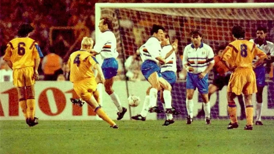 […] Al 90’ nessuna delle due vince il braccio di ferro: i tempi regolamentari terminano sullo 0-0. […] La beffa arriva al minuto 111: un contrasto fra Giovanni Invernizzi (subentrato a Bonetti durante i tempi regolamentari) ed Eusebio Sacristan viene punito dall’arbitro, il tedesco Schmidhuber, con un calcio di punizione anche troppo severo. I blucerchiati protestano ma il direttore di gara è irremovibile. Sul pallone ci sono Stoichkov, Bakero e Koeman. Il primo finta timidamente il tiro e appoggia verso il secondo, che lo tiene fermo per consentire all’olandese di scaricare un destro al fulmicotone: Pagliuca fa un passo di troppo verso la sua sinistra e si fa prendere un controtempo, è 1-0.