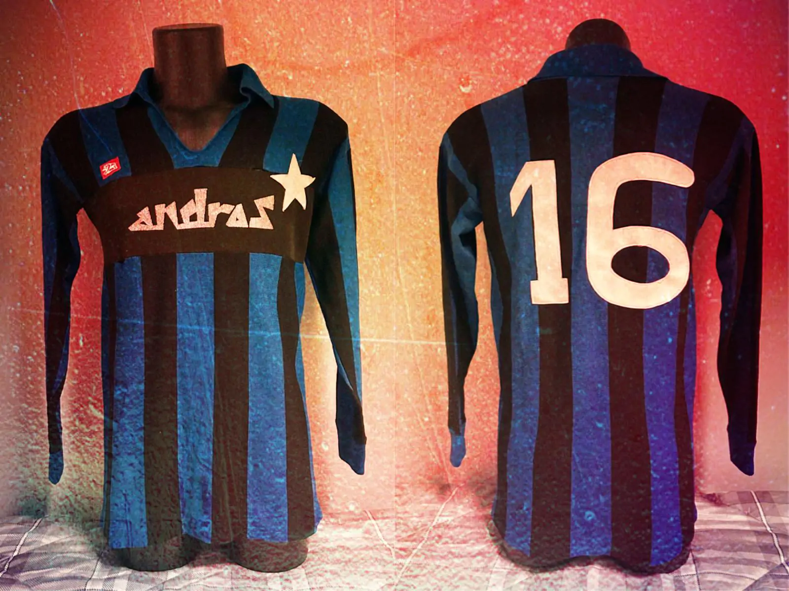 Si tratta di una bellissima “lanetta” a bande larghe verticali nerazzurre. Prodotta dalla Cinghiale Sport, azienda di Apricena, in provincia di Foggia, la maglia è a manica lunga con colletto e polsini azzurri. Al centro troviamo, in una toppa nera cucita alla maglia, lo sponsor commerciale “Andras”, non meglio identificato ma che la squadra ha usato in quella stagione alternativamente all’altro sponsor commerciale “Stasi” come si vede dalle foto allegate.