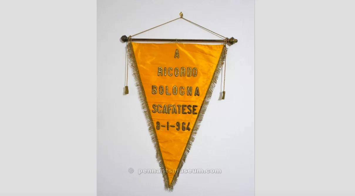 […] Un pomeriggio comune di un mercoledì post festività natalizie. Il Bologna è reduce dalla vittoria in campionato contro il Messina e si accinge ad affrontare, la domenica seguente, la Lazio. Per preparare l’importante incontro i rossoblù sono di scena a Scafati contro la formazione locale che vanta nel suo passato un passaggio in serie B alla fine degli anni quaranta e che negli anni sessanta militava stabilmente nella serie D. “I canarini” il loro soprannome e come il simpatico volatile anche le maglie della Scafatese sono in giallo. Così come il gagliardetto di quella partita su cui compaiono le lettere a comporre la frase “A ricordo Bologna Scafatese 8-1-964”.