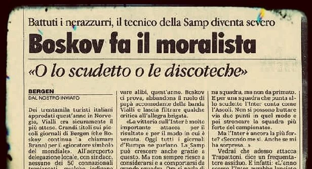 Nella fattispecie la squadra è appena arrivata in terra norvegese, a Bergen dove è di casa il Brann, avversaria di Coppa delle Coppe. I blucerchiati sono reduci dalla bella vittoria contro l’Inter e la Samp di Vujadin ormai non può nascondersi… “La vittoria sull’Inter è molto importante per il risultato e per il modo in cui è venuta. Oggi tutti i giornali d’Europa ne parlano. La Samp può crescere anche grazie a questo. Ma non sempre riesce a considerarsi e a comportarsi da grande squadra. Ora si parla di scudetto e io dico: con quindici partite come quella di domenica, lo scudetto si vince alla grande. Ma al tempo stesso non credo che la Samp sia capace di fare tanto. Magari tra una settimana gioca come ad Ascoli e allora addio sogni” (Cit. La Stampa, 12 settembre 1989).