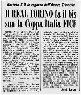 GLIEROIDELCALCIO.COM (Giovanni Di Salvo) – Il Real Torino fu la prima squadra a scrivere il proprio nome nell’albo d’oro della Coppa Italia organizzata dalla FICF. Infatti, venerdì 19 marzo 1971, le granate allenate da Giuseppe Cavicchi alzavano al cielo il trofeo dopo aver battuto per 5-0 – al “Comunale” di Torino – le palermitane dell’Amaro Trinacria. In tribuna d’onore, per assistere alla partita, vi erano il Presidente della FIEFF Vinicio Lucci e Marco Rambaudi. La Coppa Italia era iniziata la prima settimana di novembre del 1970 con le squadre partecipanti suddivise in due raggruppamenti, un girone del Nord Italia ed un altro siciliano. Le piemontesi avevano eliminato l’Astro Torino e il Vernici Milesi Parma mentre le palermitane le concittadine della Montuori e delle Perle Nere e le catanesi dell’Ares. La finale si disputò 48 ore prima della stracittadina Juventus-Torino, tra polemiche e lamentale perché c’era chi temeva che le giocatrici, in caso di pioggia, avrebbero potuto rovinare il terreno di gioco.