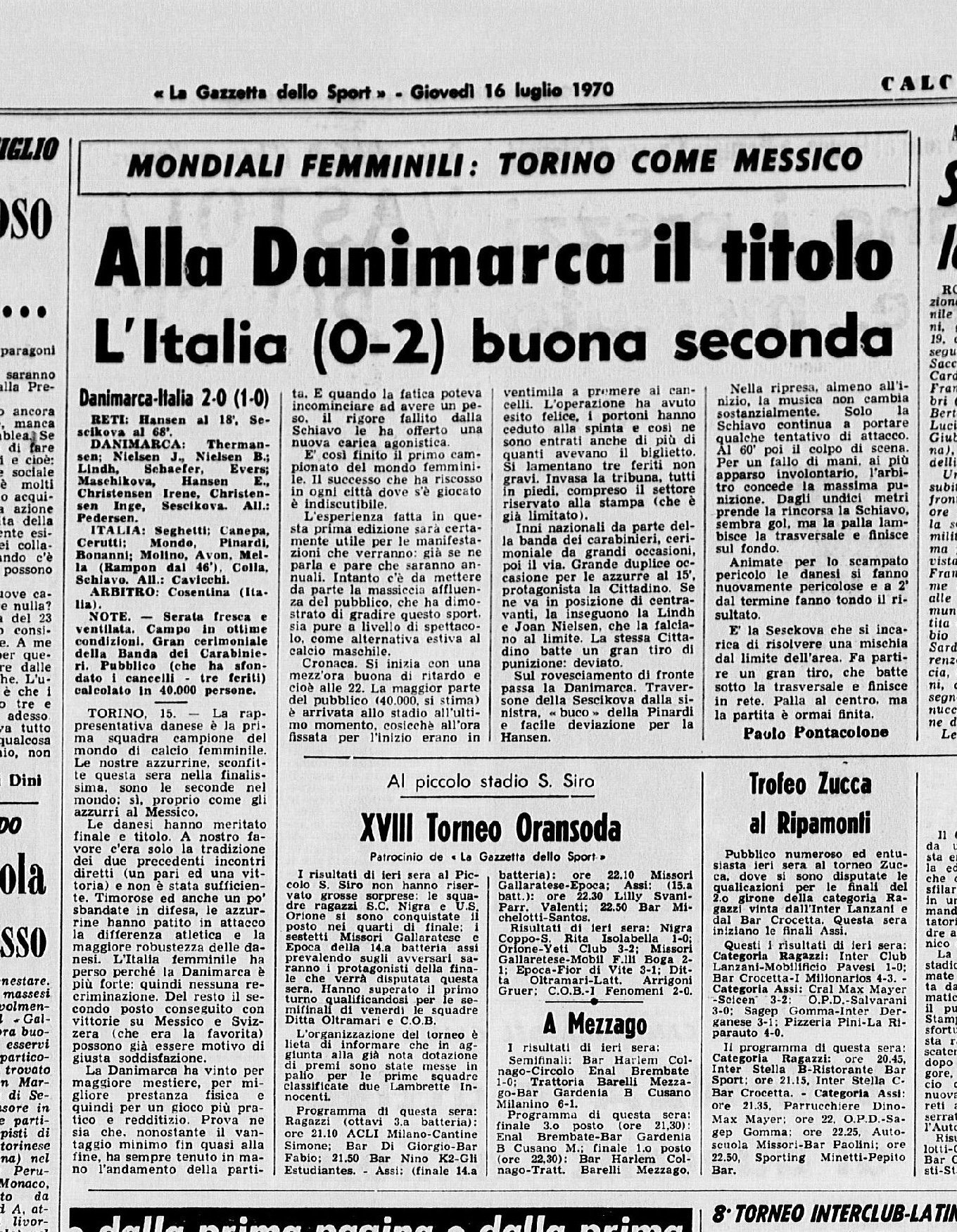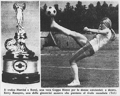 GLIEROIDELCALCIO.COM (Giovanni Di Salvo) – L’Italia tra la fine degli anni sessanta e l’inizio degli anni settanta del secolo scorso fu certamente tra i paesi più attivi e propositivi nello sviluppo del calcio femminile. Infatti dopo l’esperienza positiva della Coppa Europa, disputatasi nel 1969, l’anno seguente il Belpaese organizzò ed ospitò la prima edizione dei Campionati del Mondo. La F.I.C.F. (Federazione Italiana Calcio Femminile) è promotrice dell’istituzione della F.I.E.F.F. (Federazione Internazionale Europea Football Femminile), la cui sede è stabilita a Torino. E grazie al supporto della famosa azienda di bevande alcoliche Martini si allestisce un torneo la cui struttura ricalcava quella della Coppa Rimet in quanto viene messo in palio il “Trofeo Martini e Rossi” (una coppa in oro la cui forma si ispirava alla Nike di Samotracia), che sarebbe stato definitivamente assegnato alla squadra vincitrice di tre edizioni anche non consecutive. Le città scelte per ospitare le partite, in programma dal 7 al 15 luglio, furono Milano, Salerno, Bari, Napoli, Genova, Bologna e Torino.