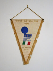 Con il cambio del simbolo della Federazione anche i gagliardetti, dal 1992, vengono rinnovati. La commessa per la produzione passa ad una ditta di Roma che fornisce la nazionale con esemplari realizzati, per la prima volta in assoluto, su tonalità bianca. Questi esemplari accompagnarono le gare degli azzurri per tutto il quadriennio fino al mondiale disputato negli Stati Uniti e perso ingloriosamente ai rigori con il Brasile. GLIEROIDELCALCIO.COM (Marco Cianfanelli)