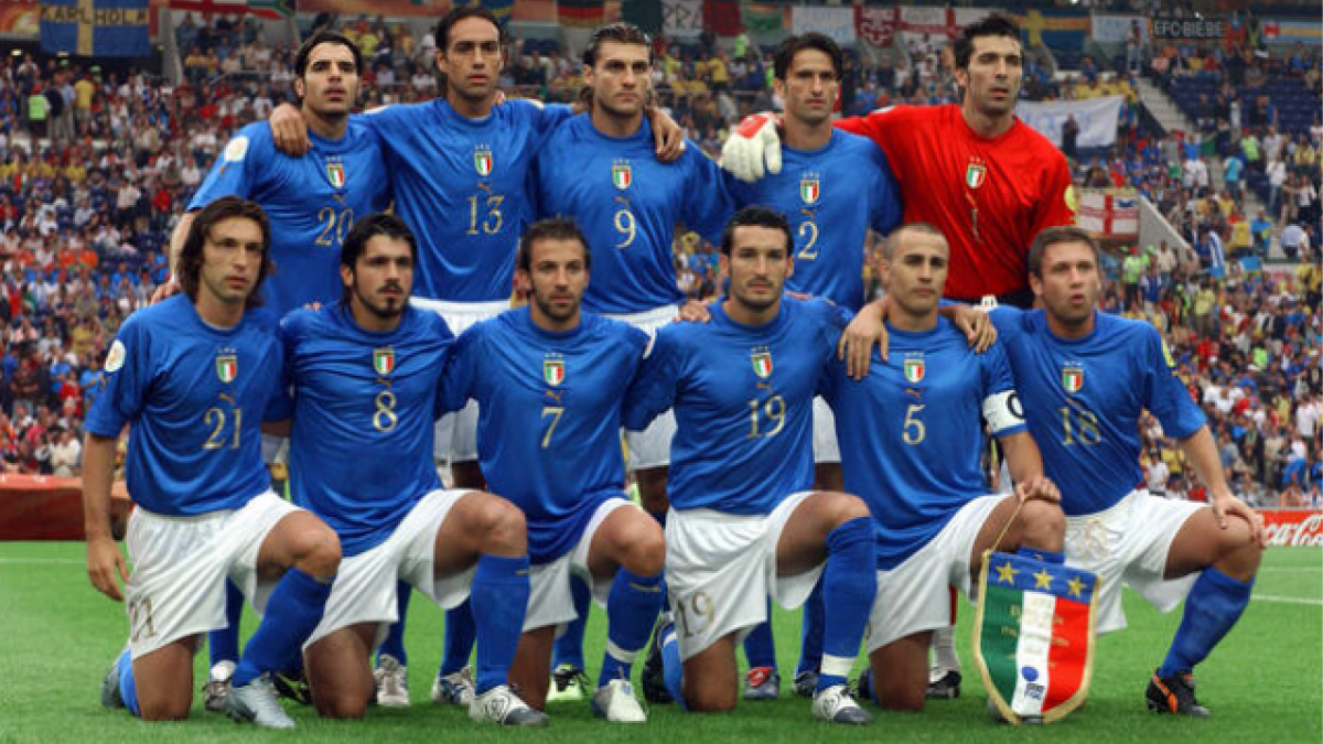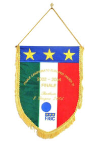 A forma di scudo con i colori del tricolore, riportano in alto una fascia azzurra in orizzontale dove trovano posto tre stelle d’oro. In basso, sulla porzione bianca del tricolore, è apposto il logo della Federazione Calcio con la I stilizzata sebbene, con il cambio dello sponsor tecnico principale sul petto delle maglie azzurre avvenuto nel 1999, trova ora posto lo scudetto tricolore con le tre stelle degli altrettanti mondiali vinti. Analoga tipologia di gagliardetti viene utilizzata anche dalla rappresentativa Under 21 con sole piccole modifiche riguardanti il ricamo dei dettagli della competizione come nel caso della fase finale degli europei di categoria disputati nel periodo 2002 – 2004.