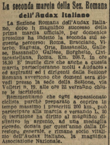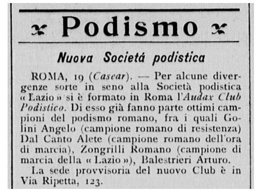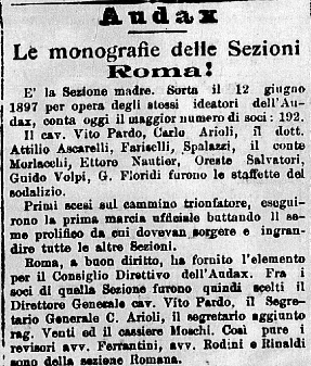 In tale indirizzo, via Velletri 19, era infatti presente la sezione romana dell’Audax italiano (o se vogliamo Audax Roma, cfr. il Messaggero 06 agosto 1924). Come possiamo vedere, questa sezione dedita al ciclismo, prende presumibilmente il via il 12 giugno 1897, quando dodici ciclisti capitanati dall’artista veneziano venticinquenne Vito Pardo partono in sella ai loro velocipedi al sorgere del sole da Roma con l’intento dichiarato di raggiungere Napoli entro il tramonto. In tale occasione si decide istituire il primo “Gruppo Audax” a cui possono aderire tutti i ciclisti in grado di percorrere 200 chilometri in bicicletta in autosufficienza entro una sola giornata. Quindi, probabilmente, se di errore si tratta, la storiografia romanista dovrebbe ricercare tale progenie in questa società ciclistica fondata a Roma il 12 Giugno del 1897, così come riportato nell’estratto di “Audax – Le monografie delle sezioni – Roma!”, in La Gazzetta dello Sport, 30 gennaio 1903.