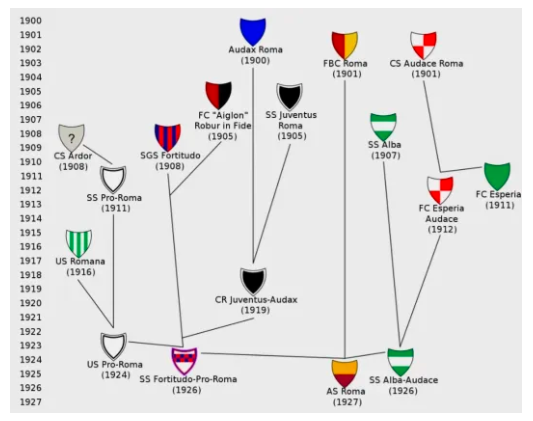 Nello schema riportato, e nelle tante ricostruzioni storigrafiche romaniste, però non troviamo quale progenitrice l’Audax Podistico Italiano, né l’Audax Club Podistico. Viene infatti spesso riportata la dicitura “Audax Roma”, riferendosi così probabilmente al Circolo romano Audax. Perché interessarci a questo circolo, ci si potrebbe chiedere? Perché tale circolo confluì nel 1919 nella Società Sportiva Juventus (fondata a Roma nel 1905) che a sua volta verrà assorbita nella Fortitudo Roma, squadra che insieme alla Società sportiva Alba – Audace ed al Foot Ball Club di Roma (o Roman) daranno vita alla Associazione Sportiva Roma nel 1927. Quindi se consideriamo la Fortitudo uno dei “genitori” della A.S. Roma, possiamo considerare forse l’”Audax Roma” un lontano prozio.