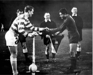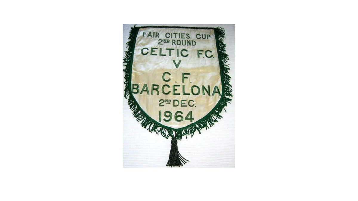 Ma anche sui gagliardetti il Celtic non è da meno in materia di attaccamento ai propri simboli e colori. Innanzitutto, su di loro era sempre presente la combinazione cromatica bianco – verde. Gli accessori (pendagli e corda in verde) erano alla base della realizzazione dei gagliardetti. I dettagli ricamati dell’incontro riportati sulla fronte. Quello odierno è l’esemplare che il capitano scozzese Billy Mc Neil consegnò il 2 dicembre 1964 al collega catalano Fernando Olivella Pons. Lo scambio è avvenuto, prima della gara di ritorno della sfida di Coppa Città delle Fiere che vide soccombere, nell’ambito dei due incontri, il Celtic.