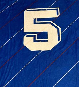 Questo modello di maglia fu utilizzato sia nella stagione 1987/88 che in quella successiva. Posso considerare, con estrema sicurezza, la mia maglia appartenente alla stagione 1988/89 per il fatto che il calciatore da cui la maglia proviene ha militato nella Centese solo in questa ultima stagione. Sul retro troviamo, in flock, il numero 5 di colore bianco.