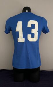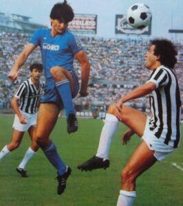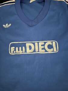 Curiosamente, questo modello di maglia fu usato nella stagione 1982-83 sempre a Torino e sempre contro i bianconeri il 19 settembre 1982: questa volta il passivo fu più accettabile, (0-2 con reti di Bettega e Platini). Quel giorno il numero 13 era sulle spalle del giovane difensore marchigiano Daniele Conti (in foto). Nelle altre due foto di quel match del Comunale, si riconoscono Walter Schachner con questo modello di maglia e un’azione di gioco della partita in cui si riconoscono Michel Platini e Daniele Arrigoni.