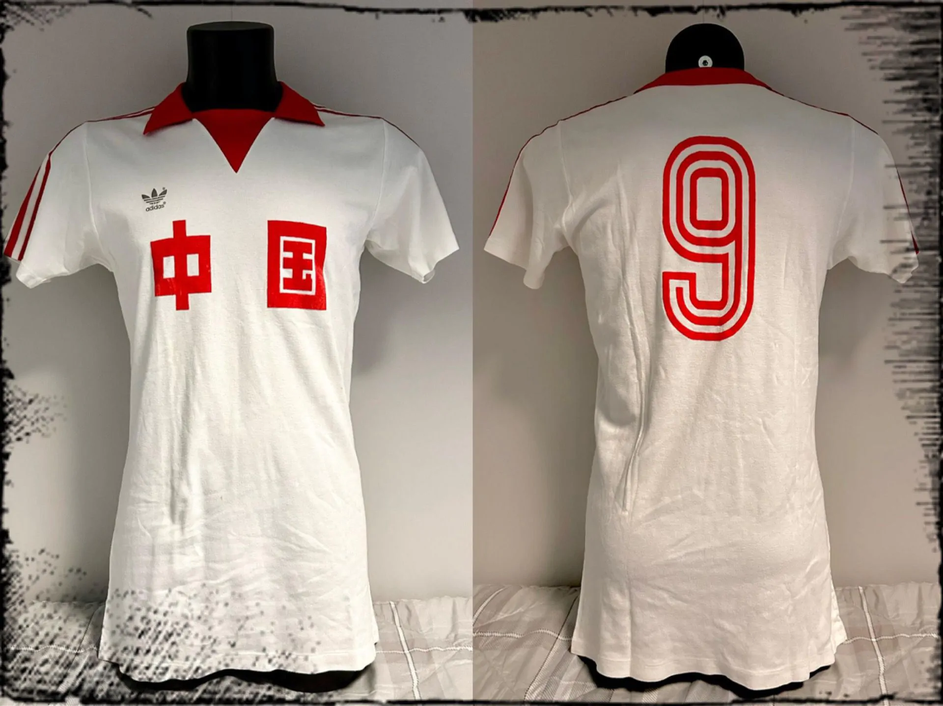 La maglia è davvero molto bella e particolare. E’ una maglia prodotta da Adidas, in un cotone pesante, usato dalle nazionali europee diversi anni prima, nel periodo che va da fine anni Settanta ai primi anni Ottanta. Al centro della maglia troviamo due ideogrammi applicati in vellutino che significano appunto “Cina”. La maglia presenta il colletto triangolare rosso con delle strisce rosse sulle spalle. Anche il numero sul retro è in vellutino, di colore rosso, applicato sulla maglia.