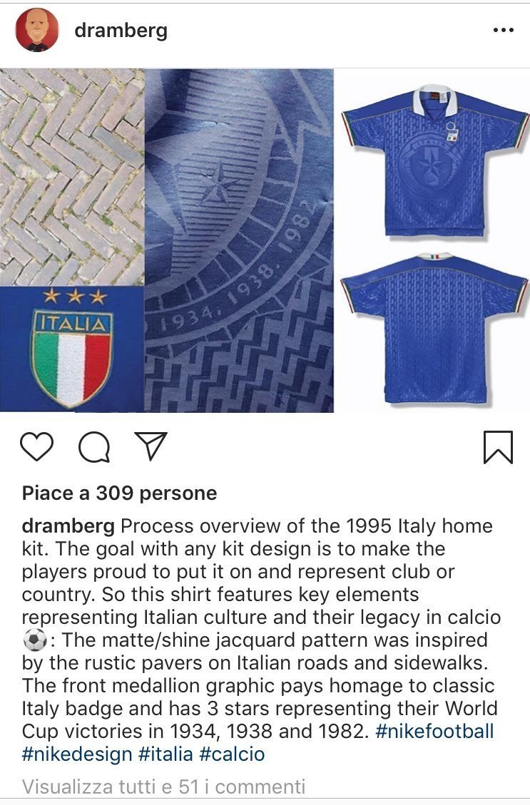 GLIEROIDELCALCIO.COM  – Qualche giorno fa, con un post su Instagram, Drake Ramberg, lo storico designer di Nike, ha svelato alcuni particolari sul processo creativo della maglia della nostra Nazionale indossata nel 1995. L’autore di molti kit degli anni ’90 ha spiegato nel post come l’obiettivo di qualsiasi “Kit design” sia quello di rendere i giocatori orgogliosi di metterlo nel rappresentare il proprio club o paese. Così in questa maglia si possono trovare alcuni elementi chiave che rappresentano la cultura italiana ispirata dalla modalità rustica di lastricare pavimentazioni di strade e marciapiedi, ma al contempo geometrica. La grafica del medaglione frontale rende omaggio al badge classico dell’Italia con le tre Stelle a rappresentare i tre campionati vinti a quella data: 1934, 1938 e 1982. Il tutto in un contrasto di lucido e opaco tipico degli anni ’90, in cui i designer osavano molto, in alcuni casi troppo. La Nike produce quindi questa maglia dall’inedito colletto bianco, oro nelle rifiniture e un bellissimo, almeno per noi, bordino tricolore sulle maniche.