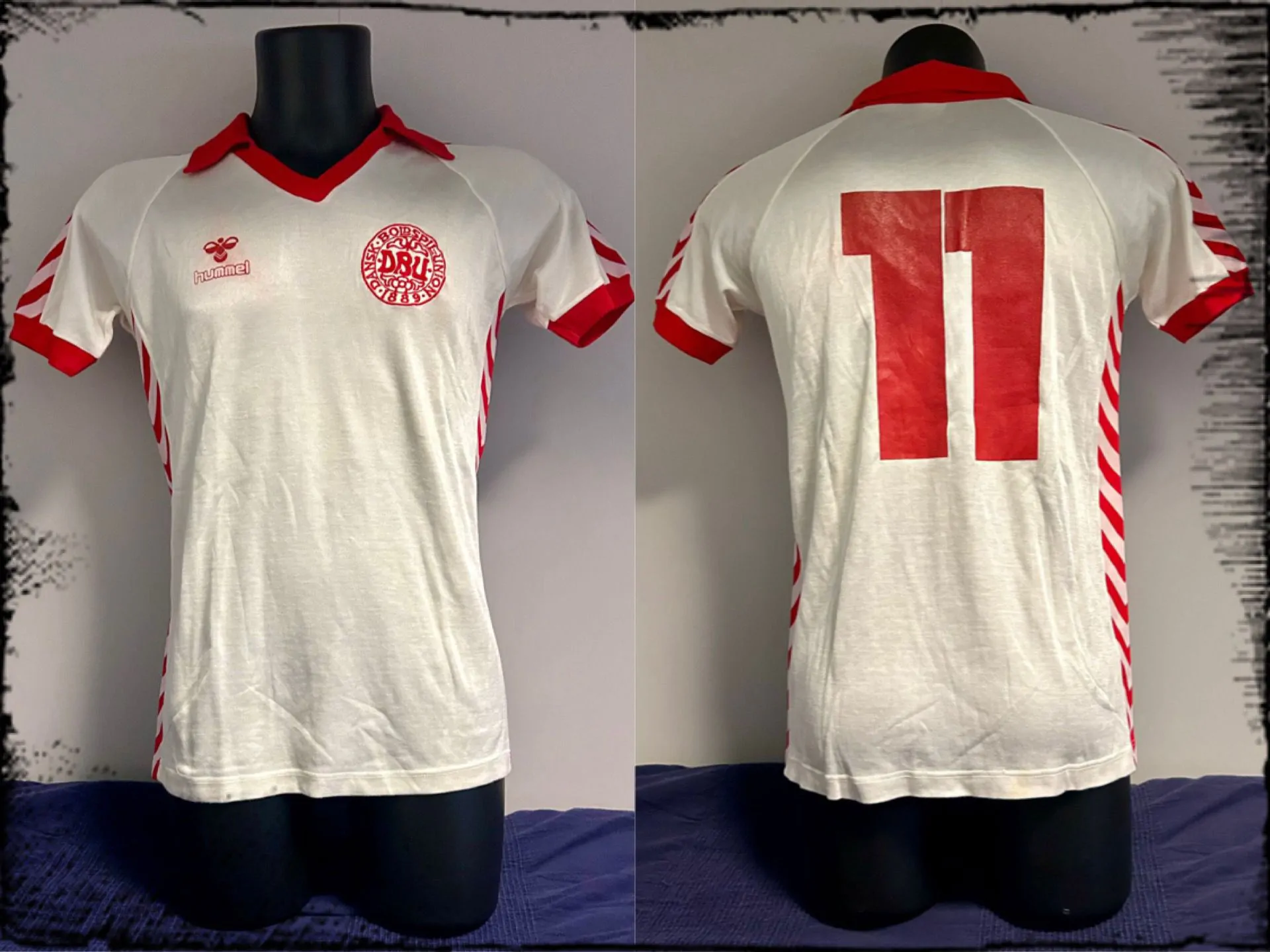 Quella in presentazione è una maglia del 1980 da trasferta a manica corta. Sempre prodotta dall’azienda tedesca, poi divenuta danese, Hummel e molto semplice, con le bande biancorosse trasversali quasi a formare un contorno nella parte esterna della maglia. Il colletto è rosso ed è morbido, così come sono rossi i bordi manica. Nella parte centrale del fronte maglia troviamo, a sinistra, lo stemma della federazione danese DBU, che sta per “Dansk Boldspil Union” con la data di fondazione risalente al 1889. Dalla parte opposta troviamo lo stemma della Hummel, simile ad un’ape stilizzata.