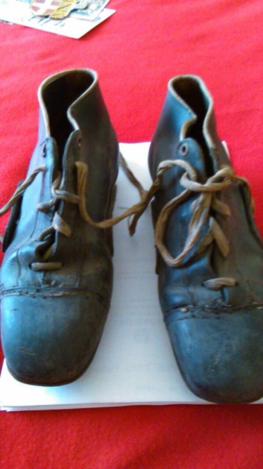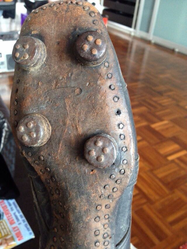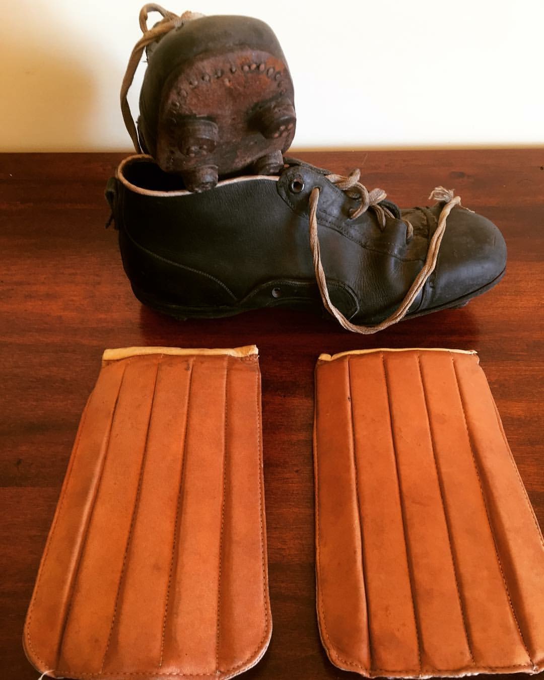 Sono in possesso anche degli scarpini e i parastinchi di Eraldo Monzeglio, grandissimo calciatore degli anni ’30 Campione del Mondo nel ’34 e nel ’38. La famiglia li ritrovò nella vecchia casa del calciatore a Roma, risalgono probabilmente proprio al periodo trascorso nella Capitale dove chiuse la carriera militando nella compagine giallorossa dal ’35 al ’39. Mi piace pensare che quella terra ancora attaccata agli scarpini provenga da Campo Testaccio.