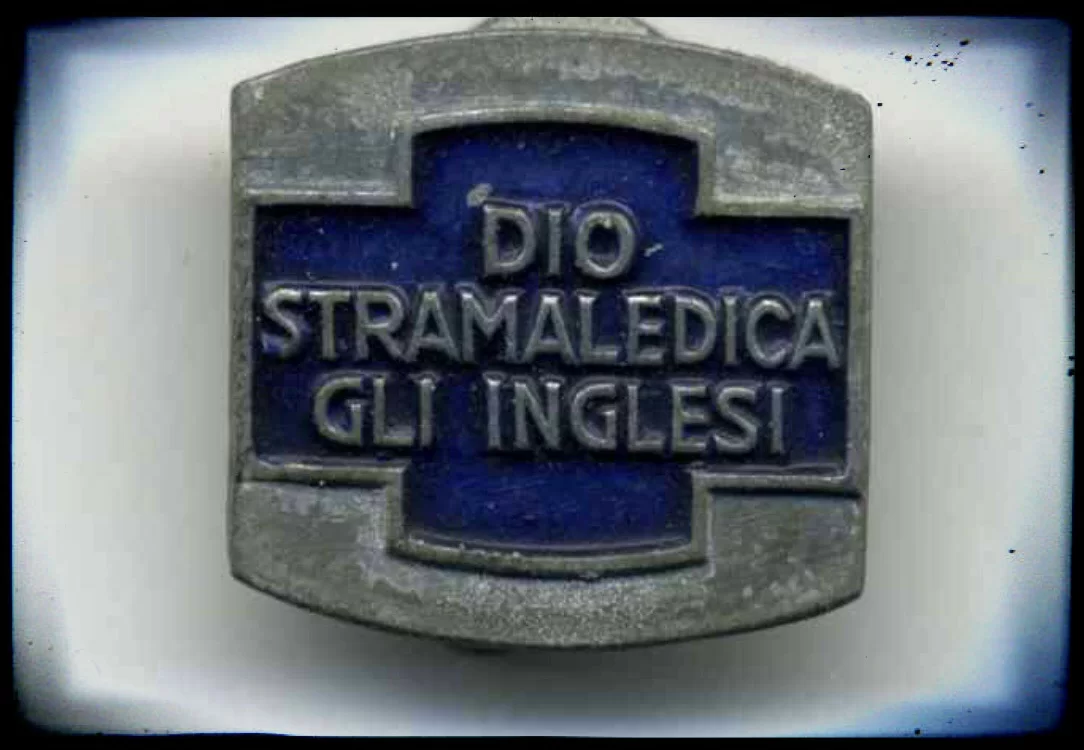 l’Eiar ricevette l’ordine di congedare il commentatore Aldo Valori e di sostituirlo con Mario Appelius, una specie di ayatollah del fascismo che inizio’ a chiudere le sue trasmissioni, con l’invocazione a Dio di «stramaledire gli inglesi» che definiva sprezzantemente «il popolo dei cinque pasti». Questa “invenzione” si trasformo’ presto in un motto di regime tanto che veniva recitato nelle scuole e stampato su ogni genere di opuscoli. Furono anche realizzati dei distintivi da portare all’occhiello della giacca, dapprima in bronzo dorato o altra lega e poi via via che la guerra proseguiva in materiale povero come “zama” o altro con spilli al posto della staffa per asola”.