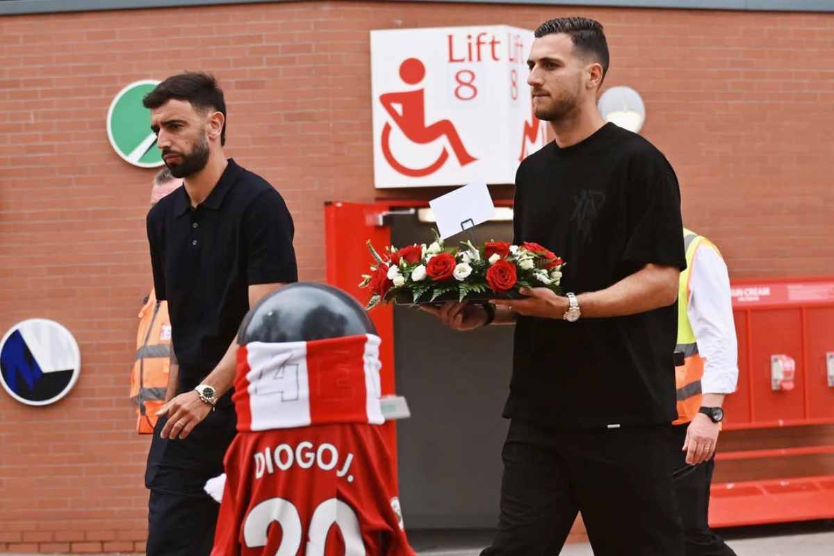 Un gesto potente, carico di significato. Perché ad Anfield, casa del Liverpool, rivale storico dello United, si è creato uno spazio di silenzio, rispetto e dolore condiviso. I fiori sono stati deposti da Ruben Amorim, allenatore portoghese, insieme a Bruno Fernandes e Diogo Dalot. Due giocatori che con Jota condividevano non solo la nazionalità, ma anche un pezzo di carriera, un’amicizia vera, uno spogliatoio, una generazione.