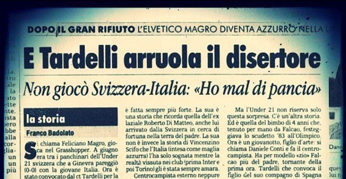 Ci si sta riferendo a Feliciano Magro, giocatore del Grasshopper che nel giugno precedente sedeva sulla panchina dell’Under 21 svizzera che pareggiò 0-0 a Ginevra contro i pari grado dell’Italia. “Durante la sfida con la nostra Nazionale giovanile, il suo tecnico (Kuhn) gli fece segno di entrare in campo. Magro rifiutò, dicendo che aveva mal di pancia. Chiamato anche per la successiva trasferta in Bielorussia, ha dato forfait sostenendo di non poter partire avendo perso il passaporto” (Cit. La Stampa, 2 ottobre 1999).