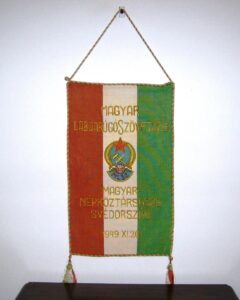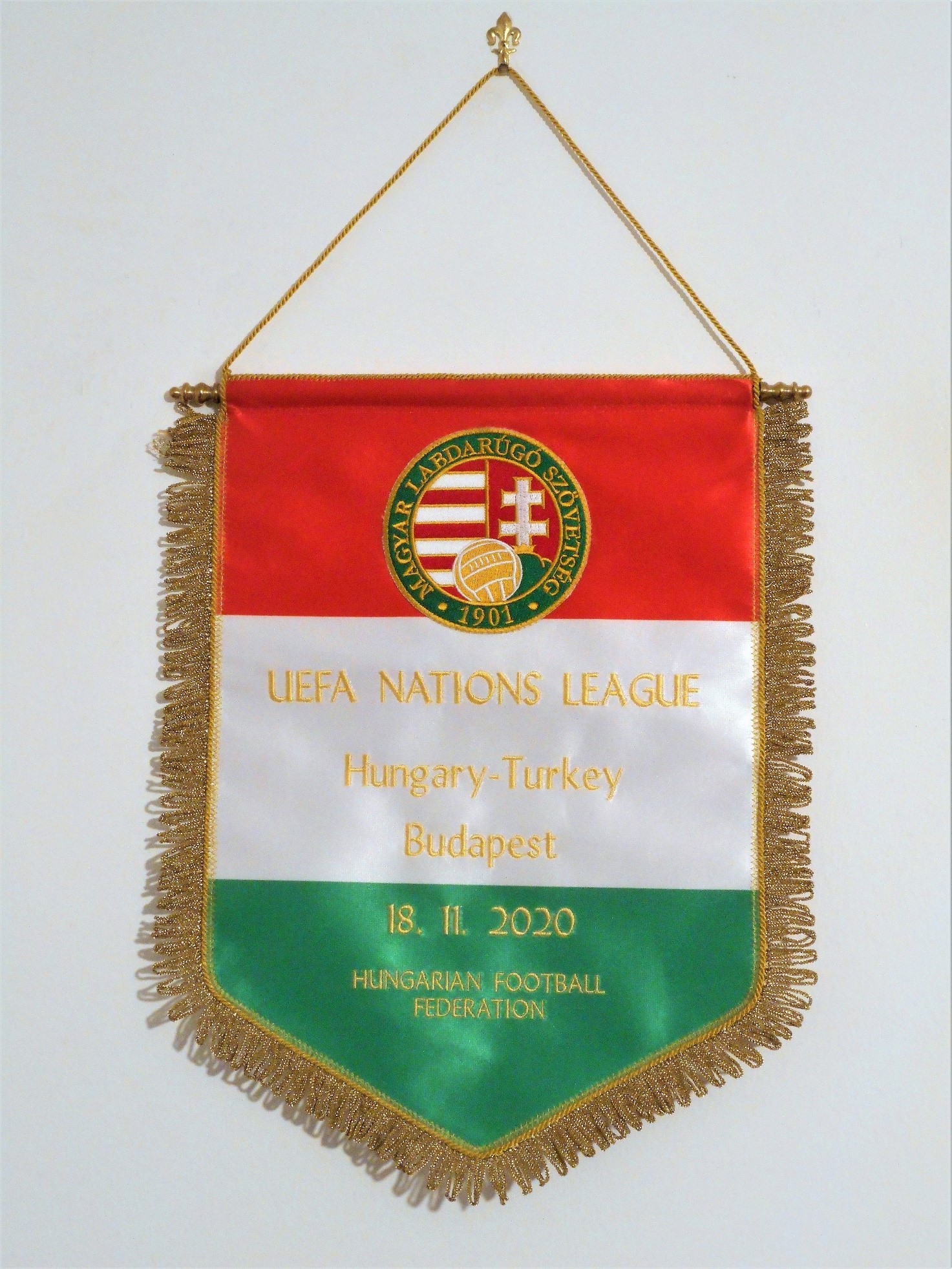 Tradizionalmente i gagliardetti ungheresi hanno sempre mostrato i colori del vessillo nazionale abbinato allo stemma della federazione che, nel periodo del regime comunista, riportava le insegne allora in uso. Parlando della nazionale ungherese la memoria non può far altro che tornare addietro ai tempi che furono quelli della cosiddetta “squadra d’oro” in ungherese “Aranycsapat”. Commemoriamo, con l’occasione, quella squadra di grandissimi campioni con il gagliardetto nella foto a seguito a immortalare la bellezza di una squadra rimasta nella mente di tutti amanti del bel calcio.