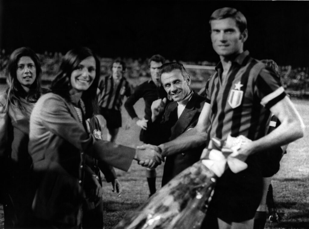 “Si esatto. Infatti quando la squadra maschile del Piacenza giocava in casa e noi non eravamo impegnate nel nostro campionato, prima del fischio d’inizio scendevamo in campo anche noi e consegnavamo alla squadra avversaria un mazzo di fiori ed un gagliardetto e poi facevamo una foto di rito. Il 1° settembre del 1971 abbiamo incontrato anche i giocatori dell’Inter, impegnati in un’amichevole. Il calciatore che più mi rimase impresso fu Facchetti, gran giocatore. E poi ho avuto anche la possibilità di conoscere Rivera, il mio idolo, e Prati del Milan. Molti giornalisti mi hanno paragonato proprio a Rivera. Giancarlo Summonte, invece, mi ha accostato a Benetti ma io non mi trovo d’accordo perché avevamo un modo di giocare molto diverso: lui era un mastino mentre io, al contrario, evitavo il gioco duro.”