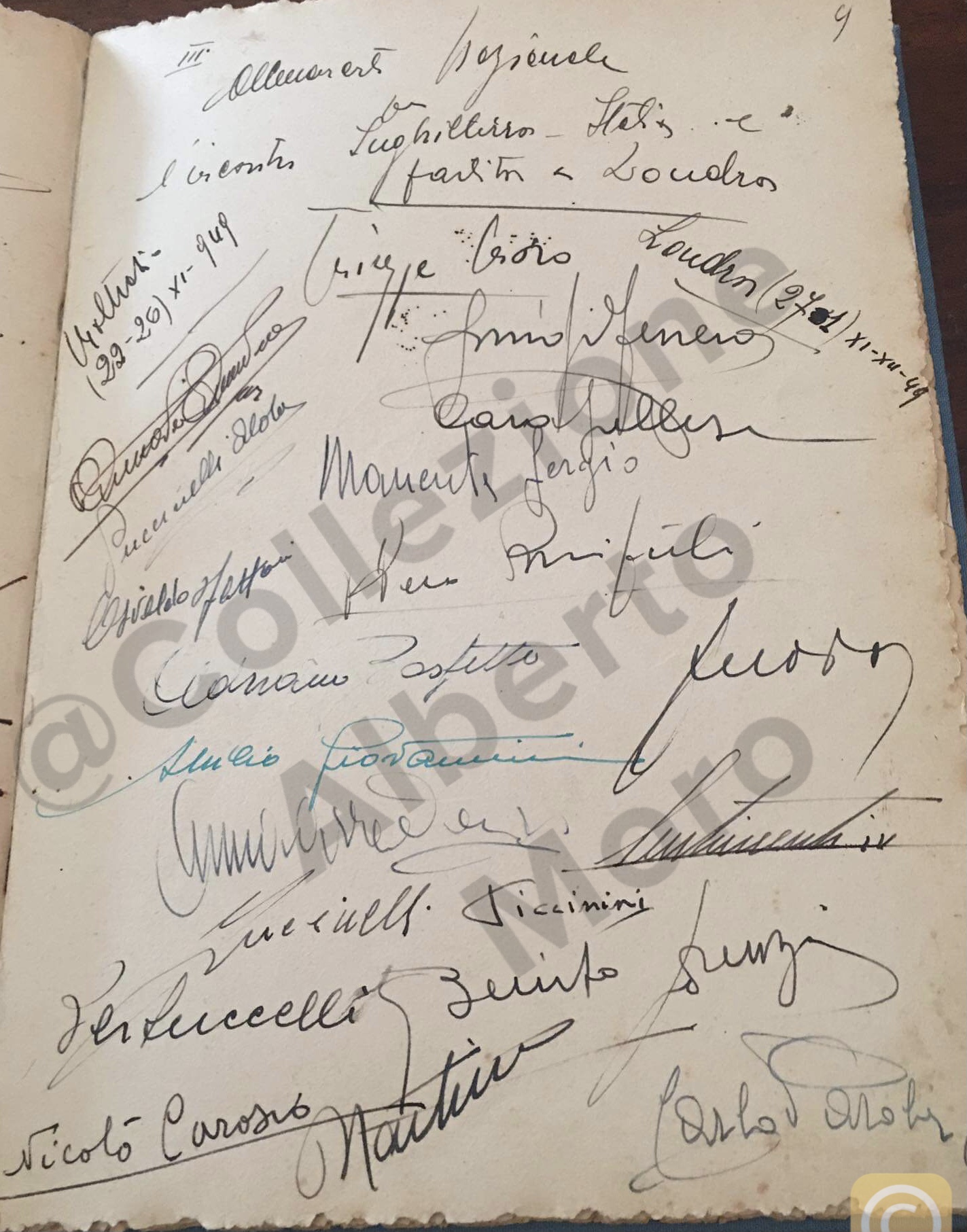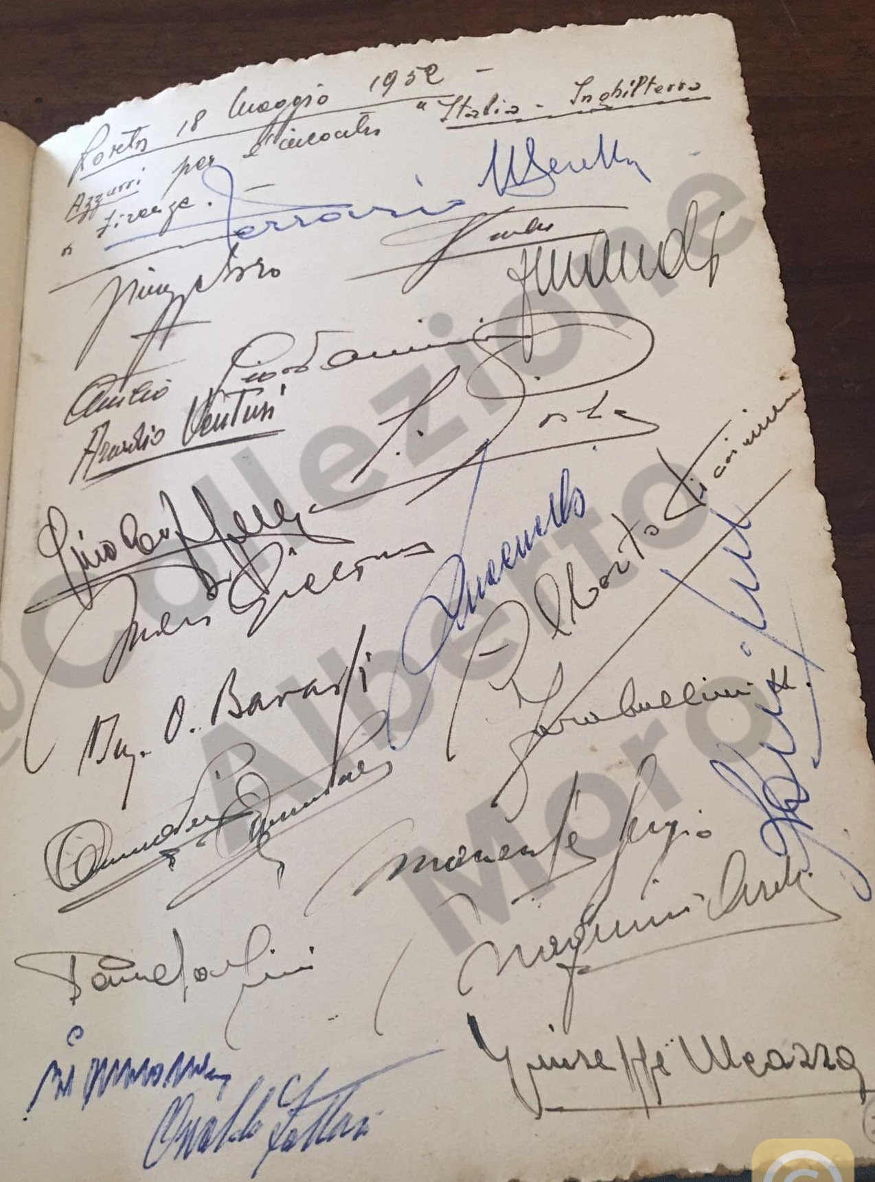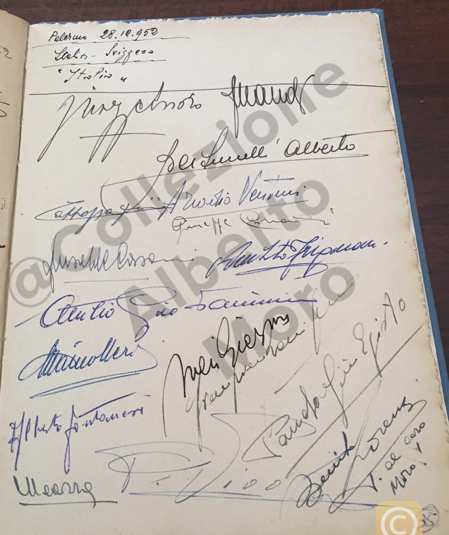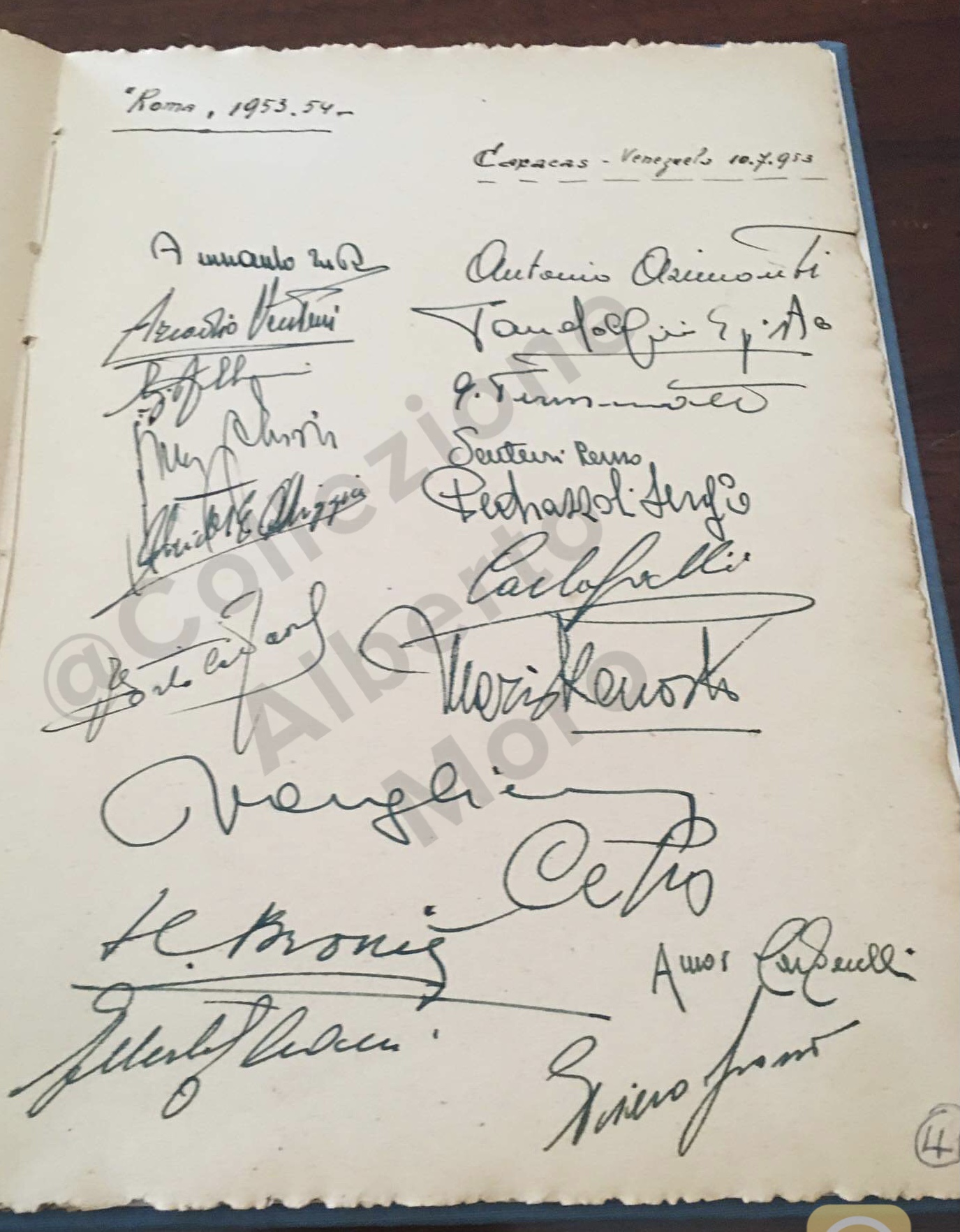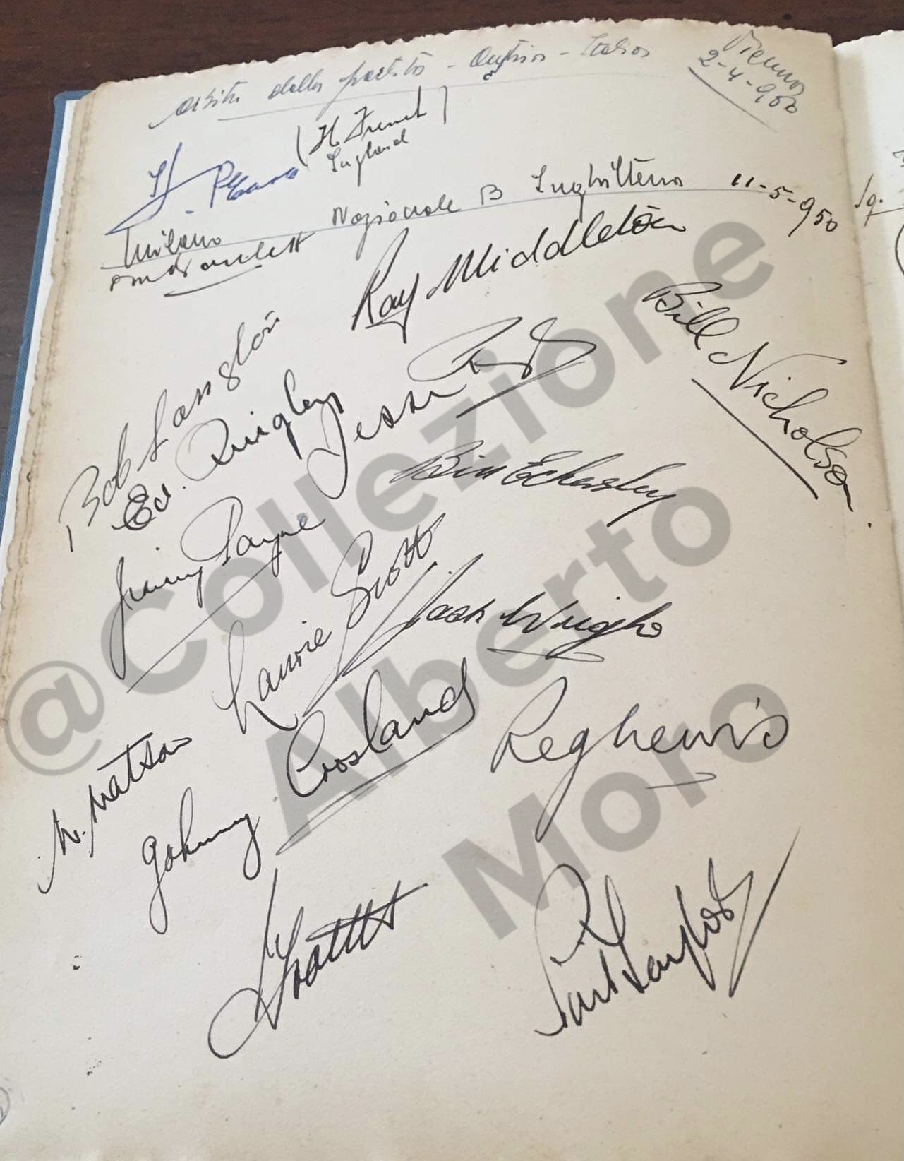 Beh un quaderno fantastico… con gli autografi impressionanti … i calciatori della nazionale inglese del ’49, la Roma del 1953 in tournee a Caracas, ma anche Corinthias, Barcellona, Caracas, Cecoslovacchia, Svizzera, Austria, Fiorentina, Bologna, Inter, Venezia, Padova, Pro Patria, Lucchese, Torino, Milan, Sampdoria, Triestina, Atalanta, Lazio, Palermo, Juventus, Roma. Firme quali quelle di Meazza e Zamora… beh cercate voi di capire le altre a chi si riferiscono…