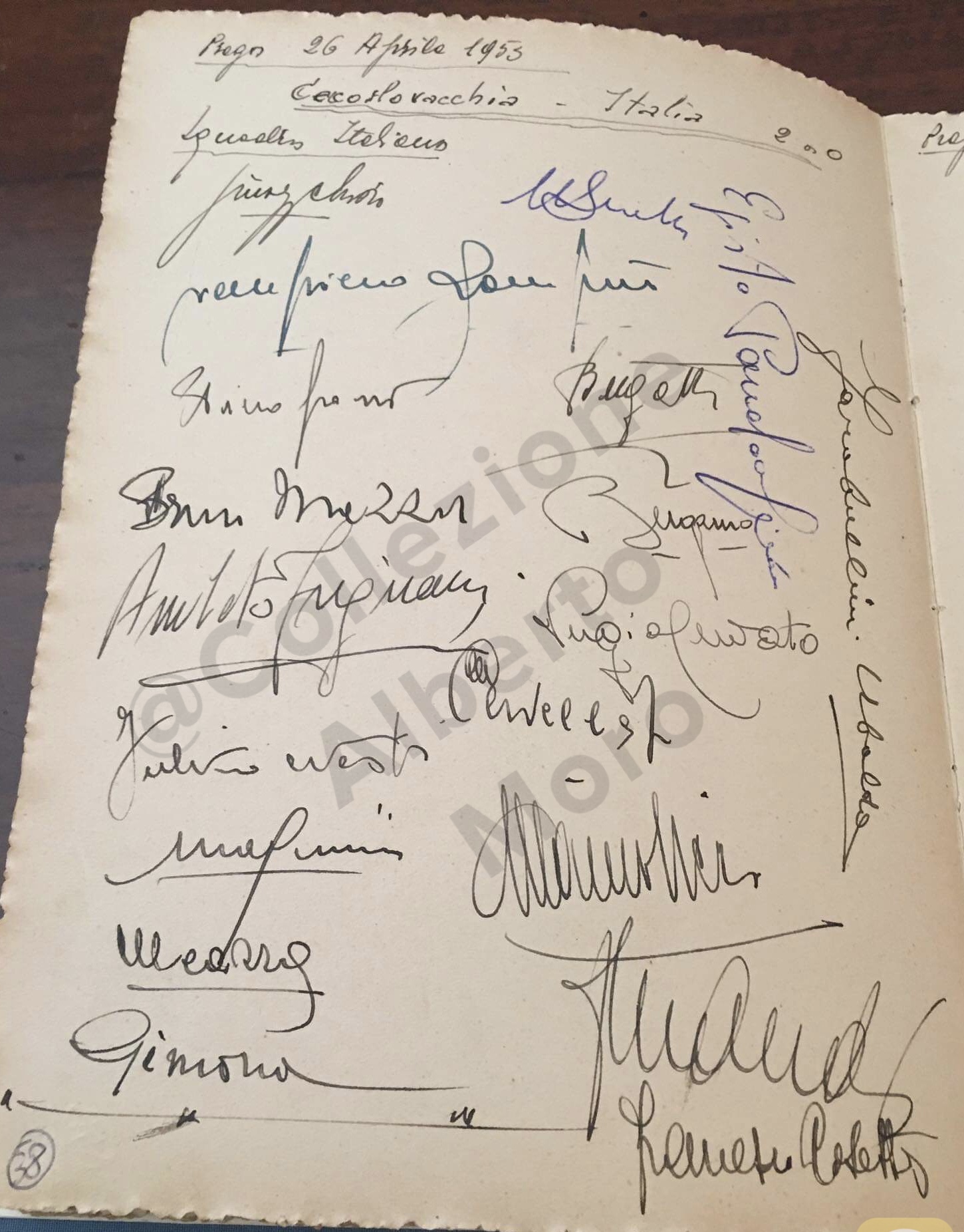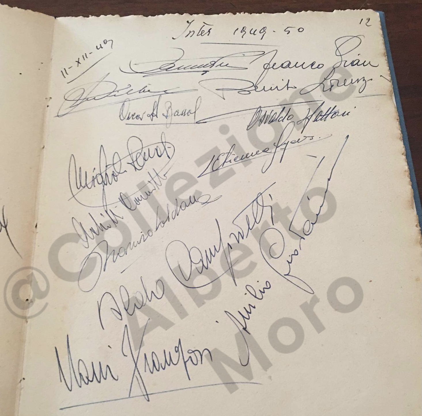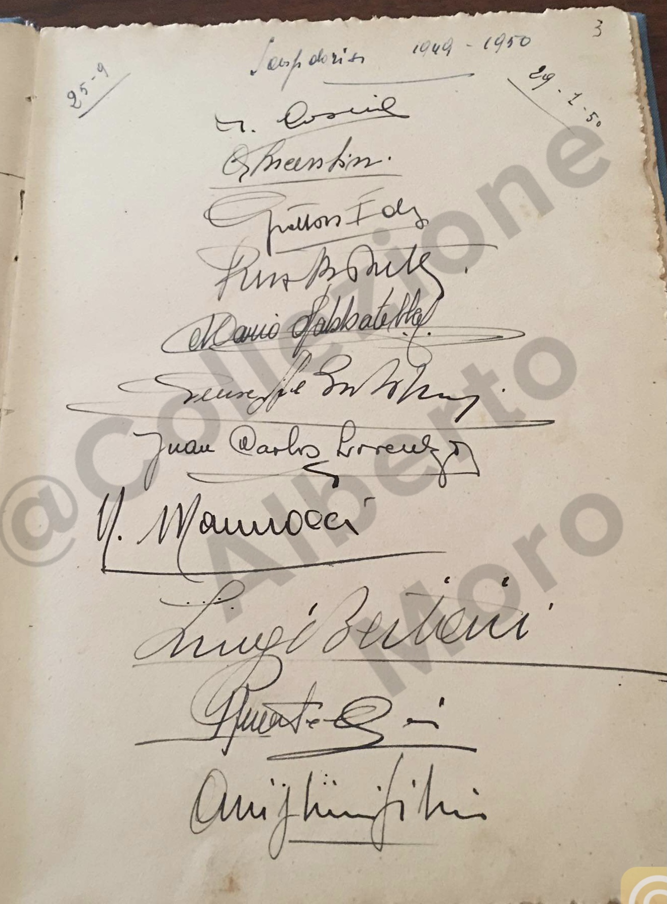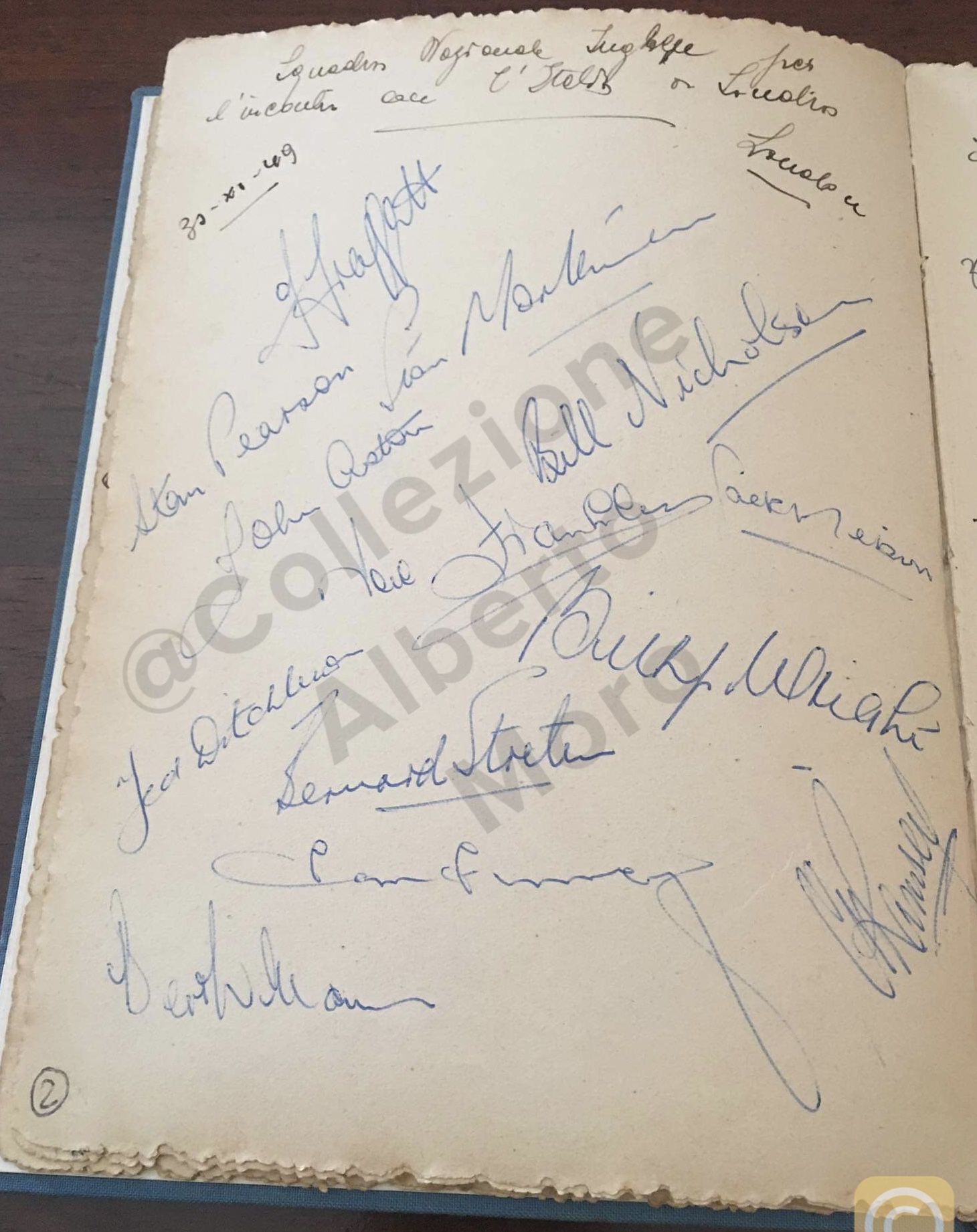 Beh un quaderno fantastico… con gli autografi impressionanti … i calciatori della nazionale inglese del ’49, la Roma del 1953 in tournee a Caracas, ma anche Corinthias, Barcellona, Caracas, Cecoslovacchia, Svizzera, Austria, Fiorentina, Bologna, Inter, Venezia, Padova, Pro Patria, Lucchese, Torino, Milan, Sampdoria, Triestina, Atalanta, Lazio, Palermo, Juventus, Roma. Firme quali quelle di Meazza e Zamora… beh cercate voi di capire le altre a chi si riferiscono…