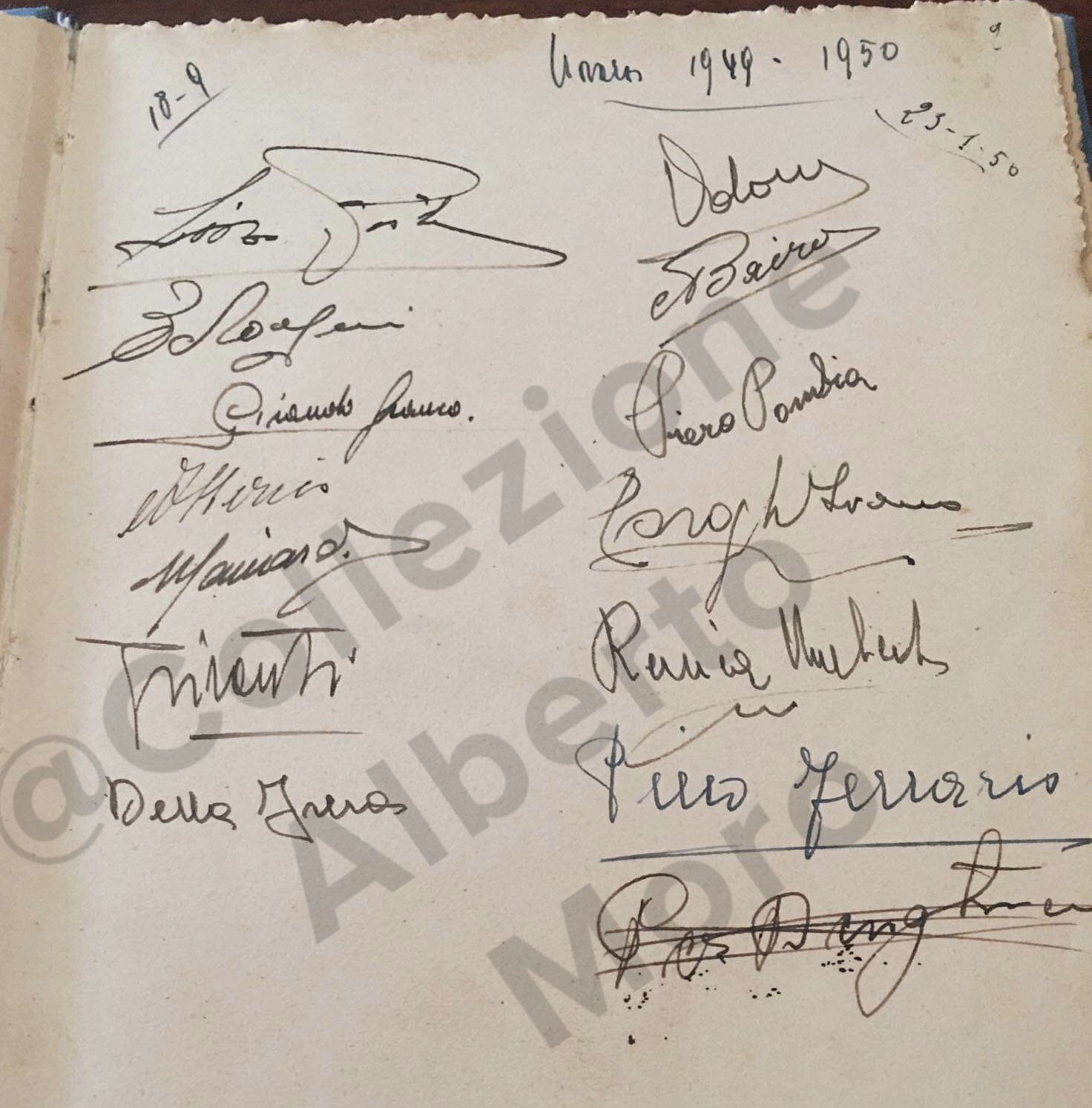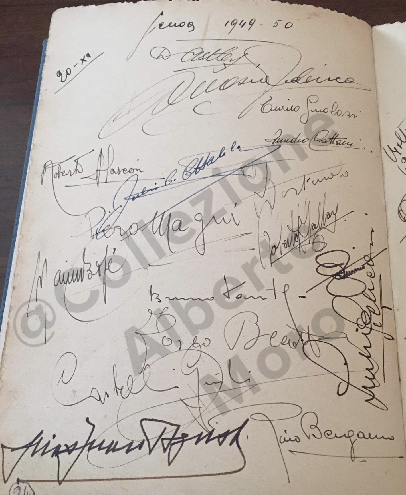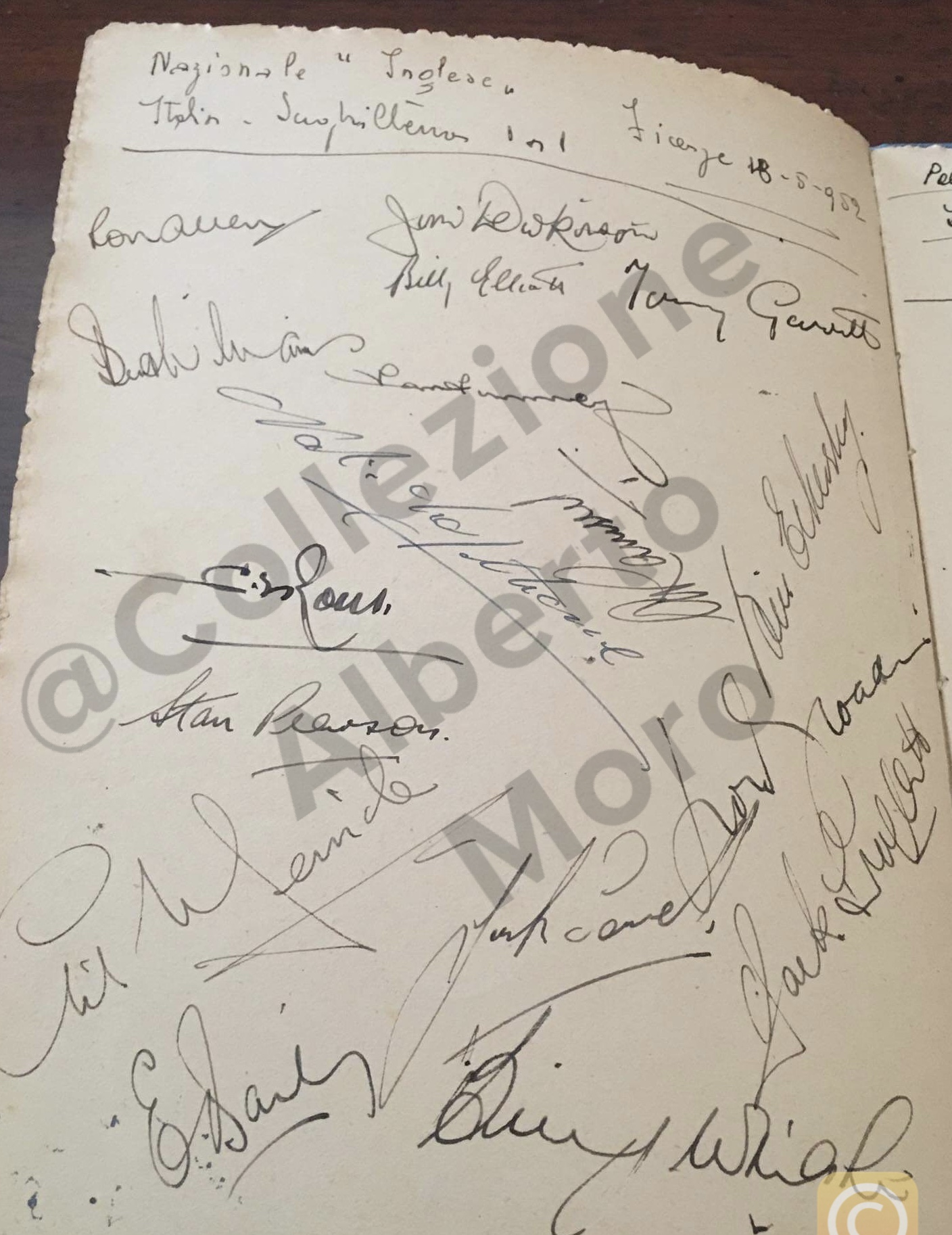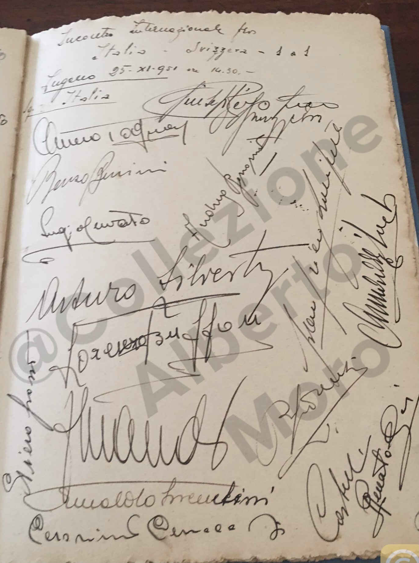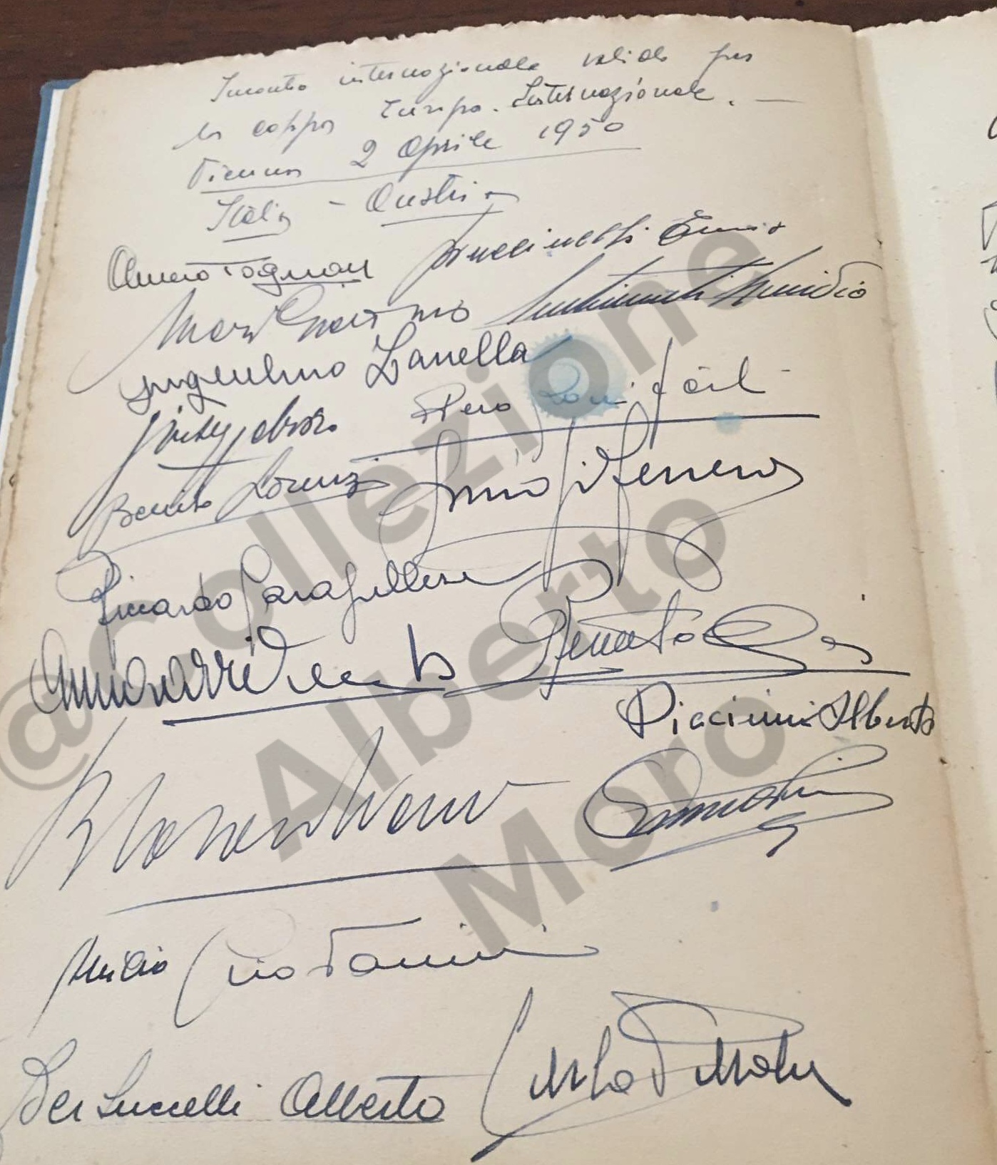 Beh un quaderno fantastico… con gli autografi impressionanti … i calciatori della nazionale inglese del ’49, la Roma del 1953 in tournee a Caracas, ma anche Corinthias, Barcellona, Caracas, Cecoslovacchia, Svizzera, Austria, Fiorentina, Bologna, Inter, Venezia, Padova, Pro Patria, Lucchese, Torino, Milan, Sampdoria, Triestina, Atalanta, Lazio, Palermo, Juventus, Roma. Firme quali quelle di Meazza e Zamora… beh cercate voi di capire le altre a chi si riferiscono…