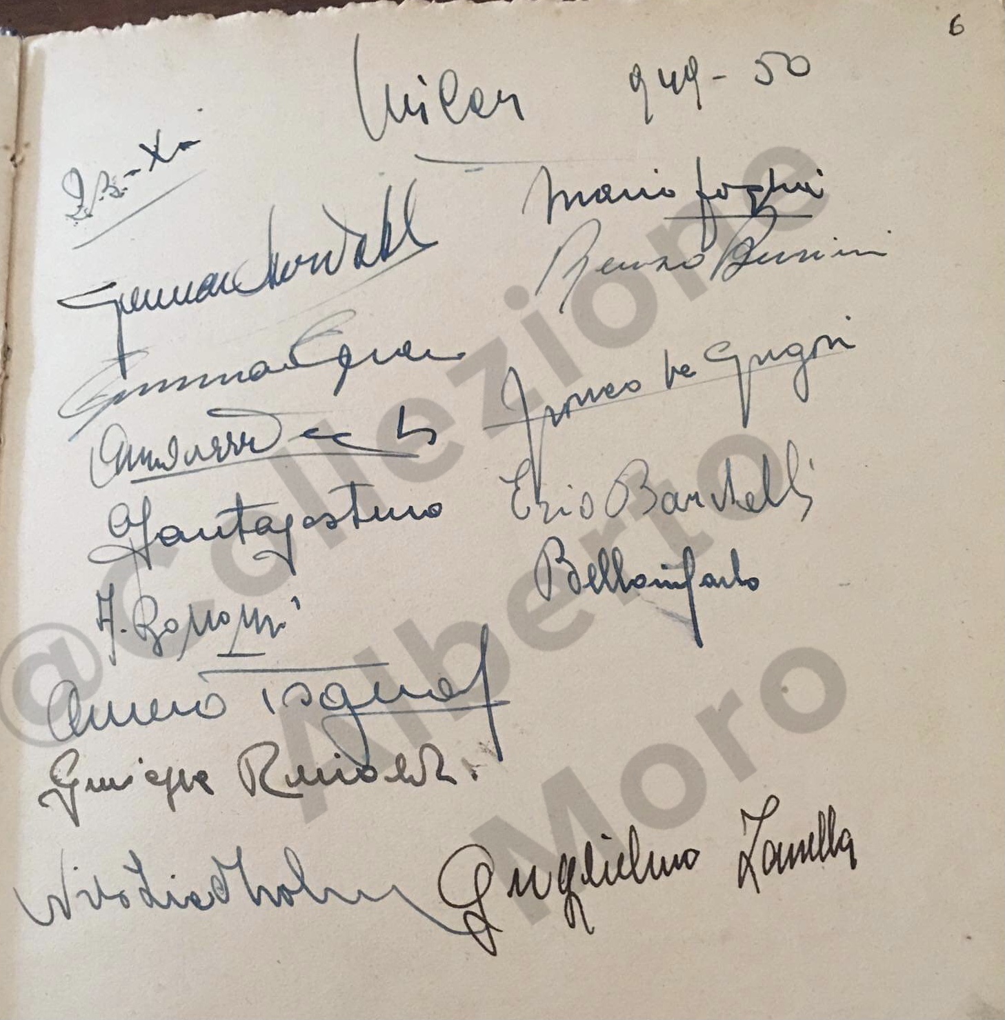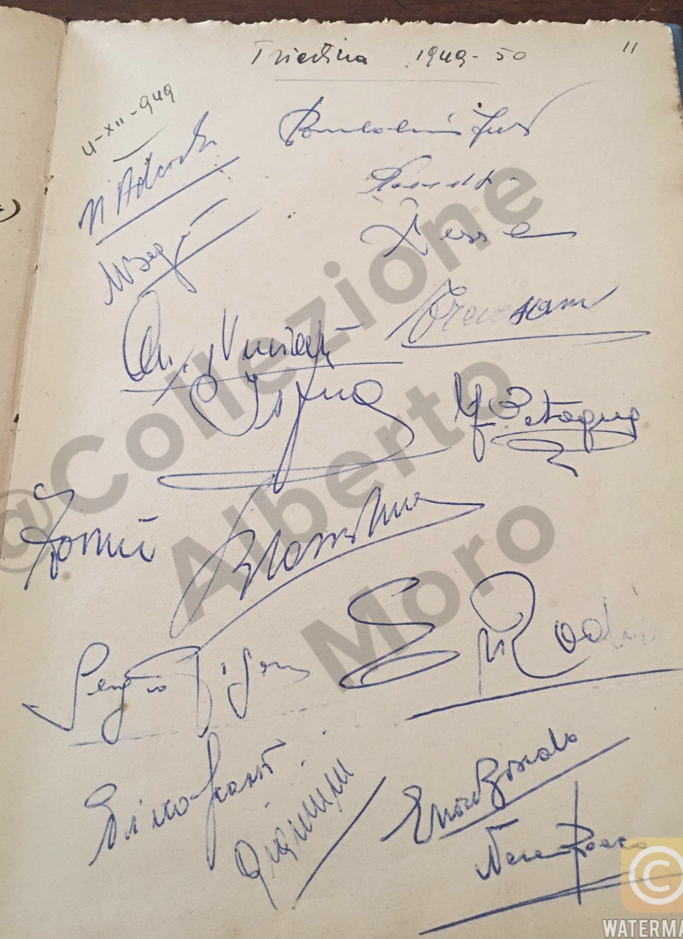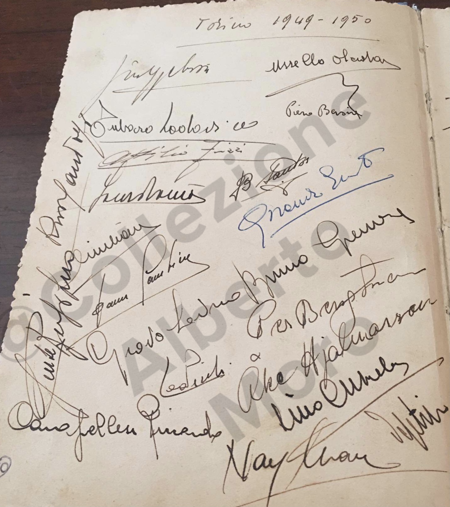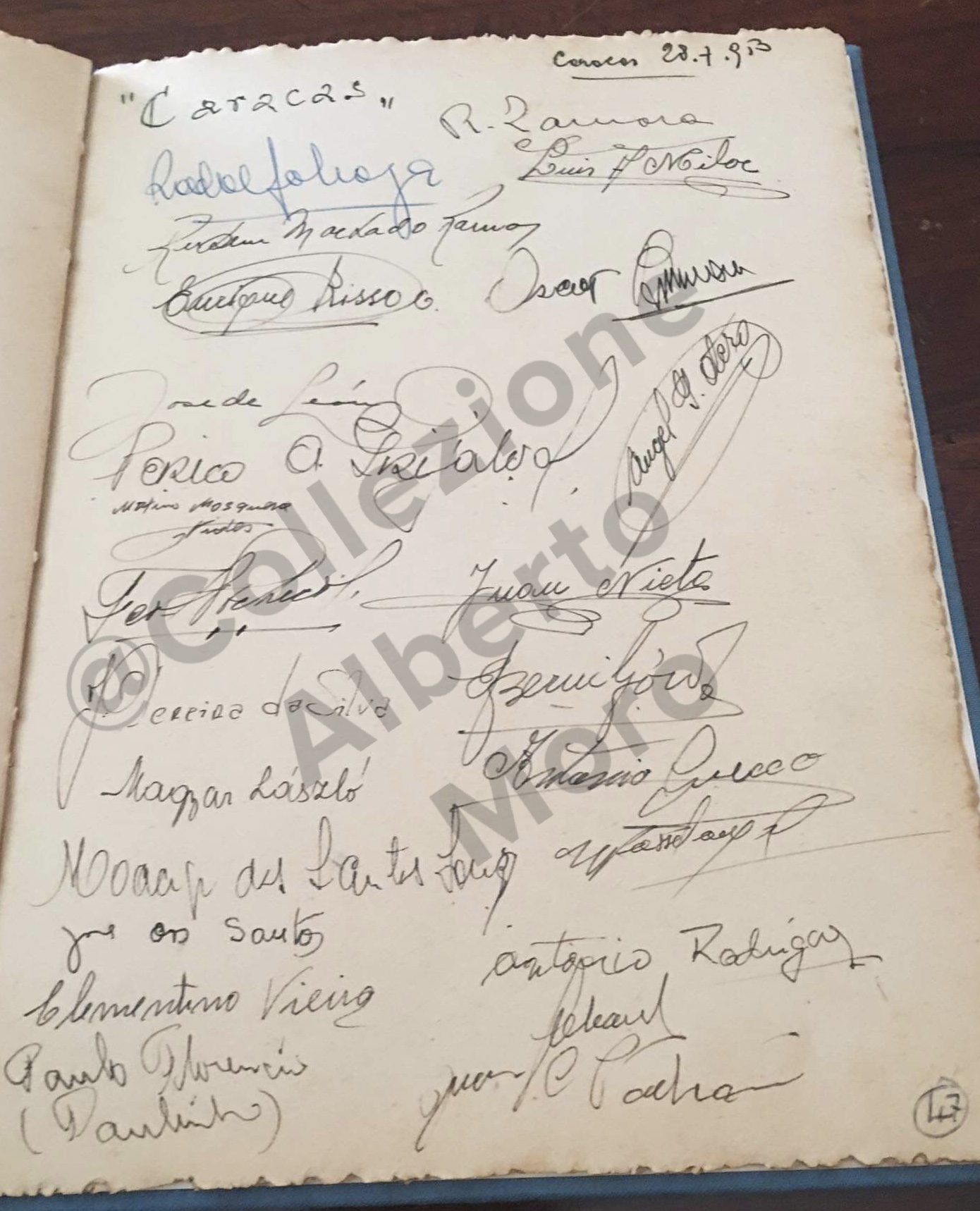 Beh un quaderno fantastico… con gli autografi impressionanti … i calciatori della nazionale inglese del ’49, la Roma del 1953 in tournee a Caracas, ma anche Corinthias, Barcellona, Caracas, Cecoslovacchia, Svizzera, Austria, Fiorentina, Bologna, Inter, Venezia, Padova, Pro Patria, Lucchese, Torino, Milan, Sampdoria, Triestina, Atalanta, Lazio, Palermo, Juventus, Roma. Firme quali quelle di Meazza e Zamora… beh cercate voi di capire le altre a chi si riferiscono…