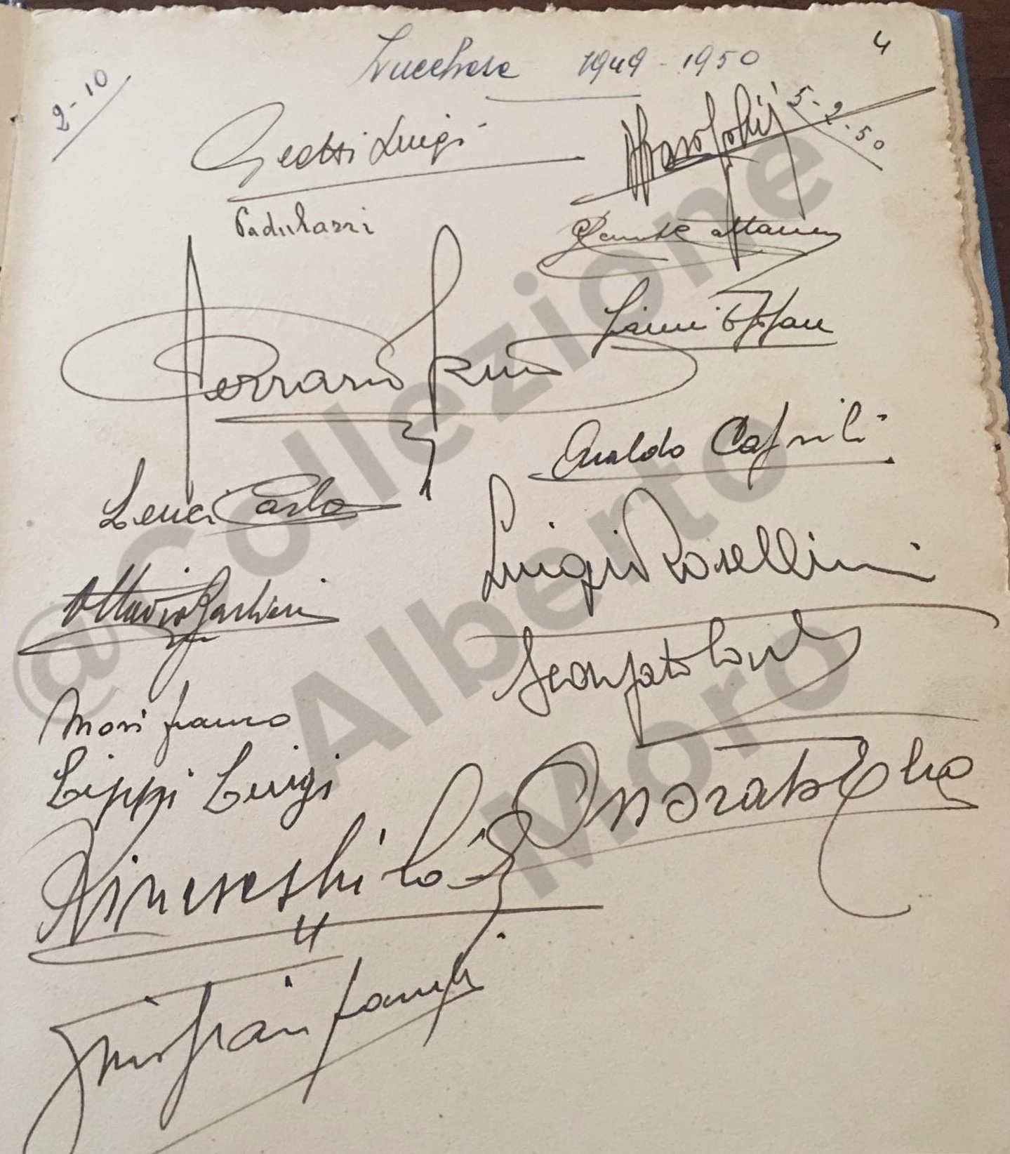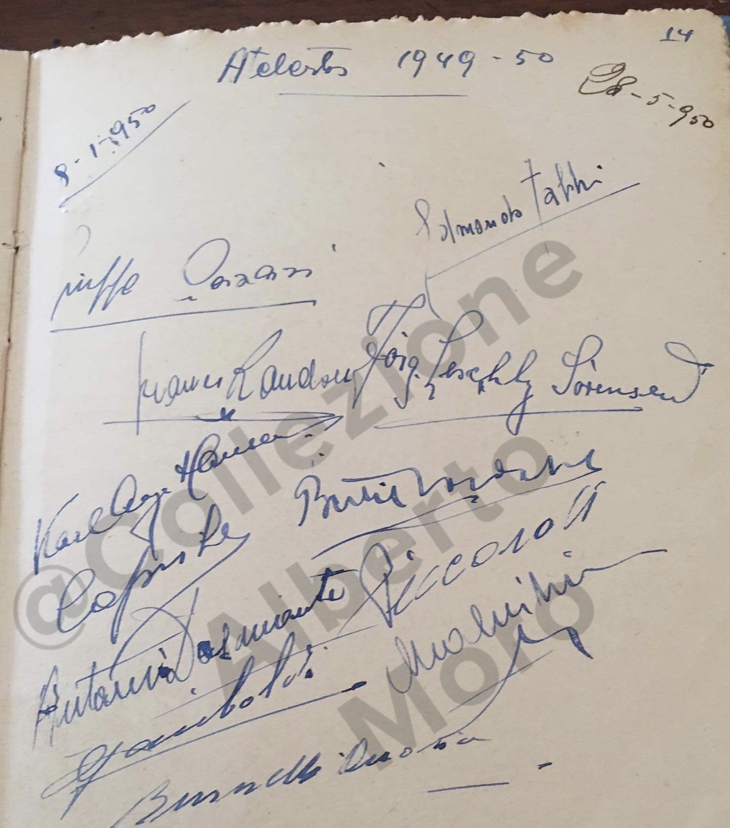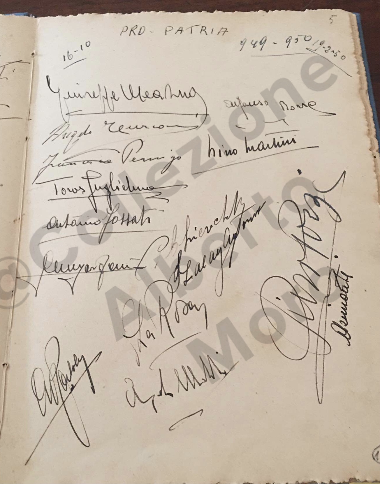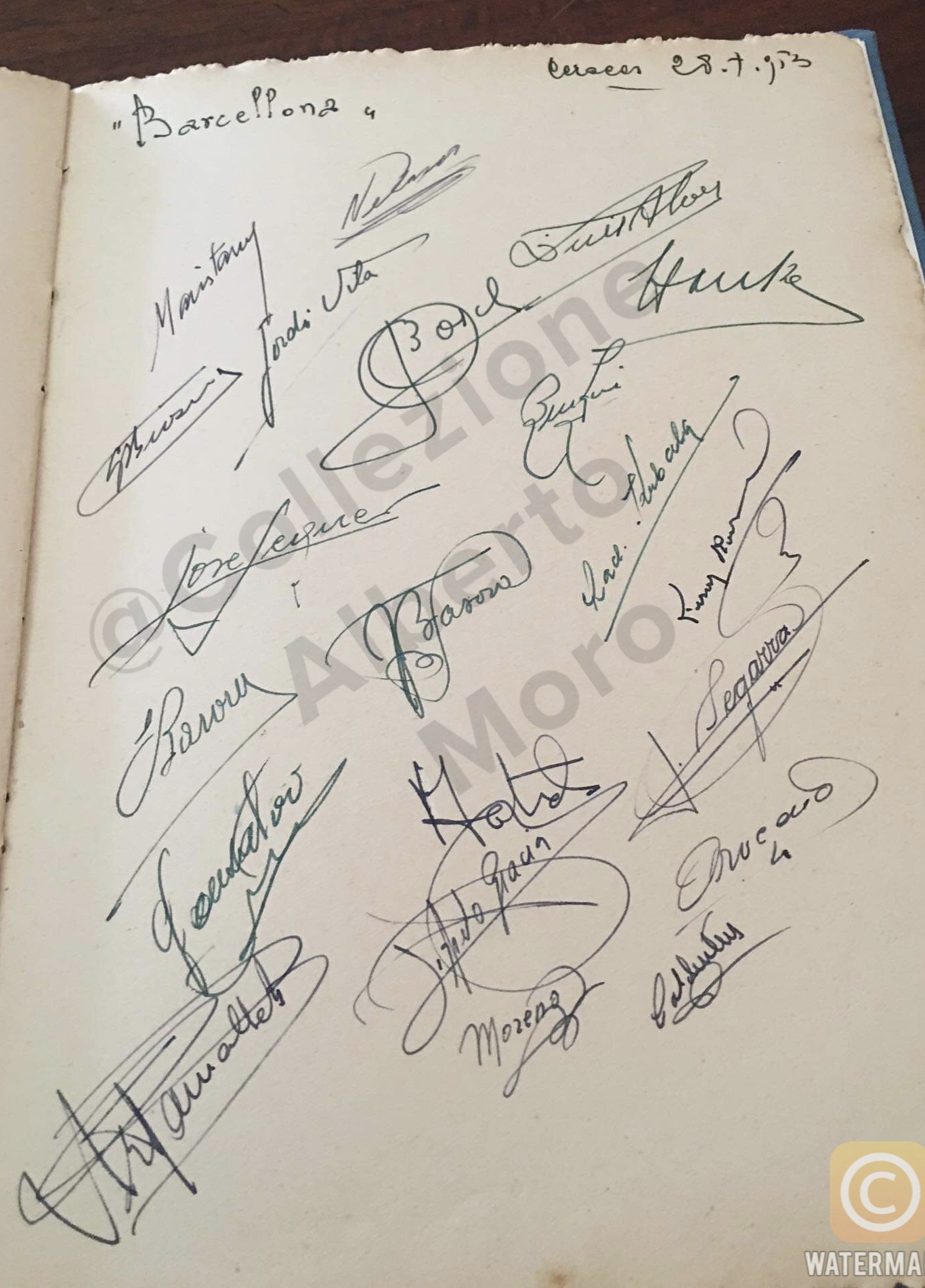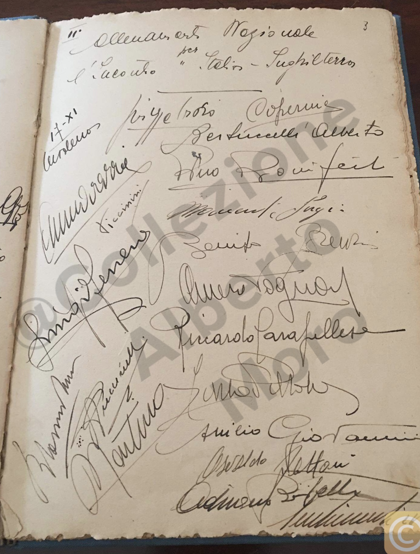 Beh un quaderno fantastico… con gli autografi impressionanti … i calciatori della nazionale inglese del ’49, la Roma del 1953 in tournee a Caracas, ma anche Corinthias, Barcellona, Caracas, Cecoslovacchia, Svizzera, Austria, Fiorentina, Bologna, Inter, Venezia, Padova, Pro Patria, Lucchese, Torino, Milan, Sampdoria, Triestina, Atalanta, Lazio, Palermo, Juventus, Roma. Firme quali quelle di Meazza e Zamora… beh cercate voi di capire le altre a chi si riferiscono…