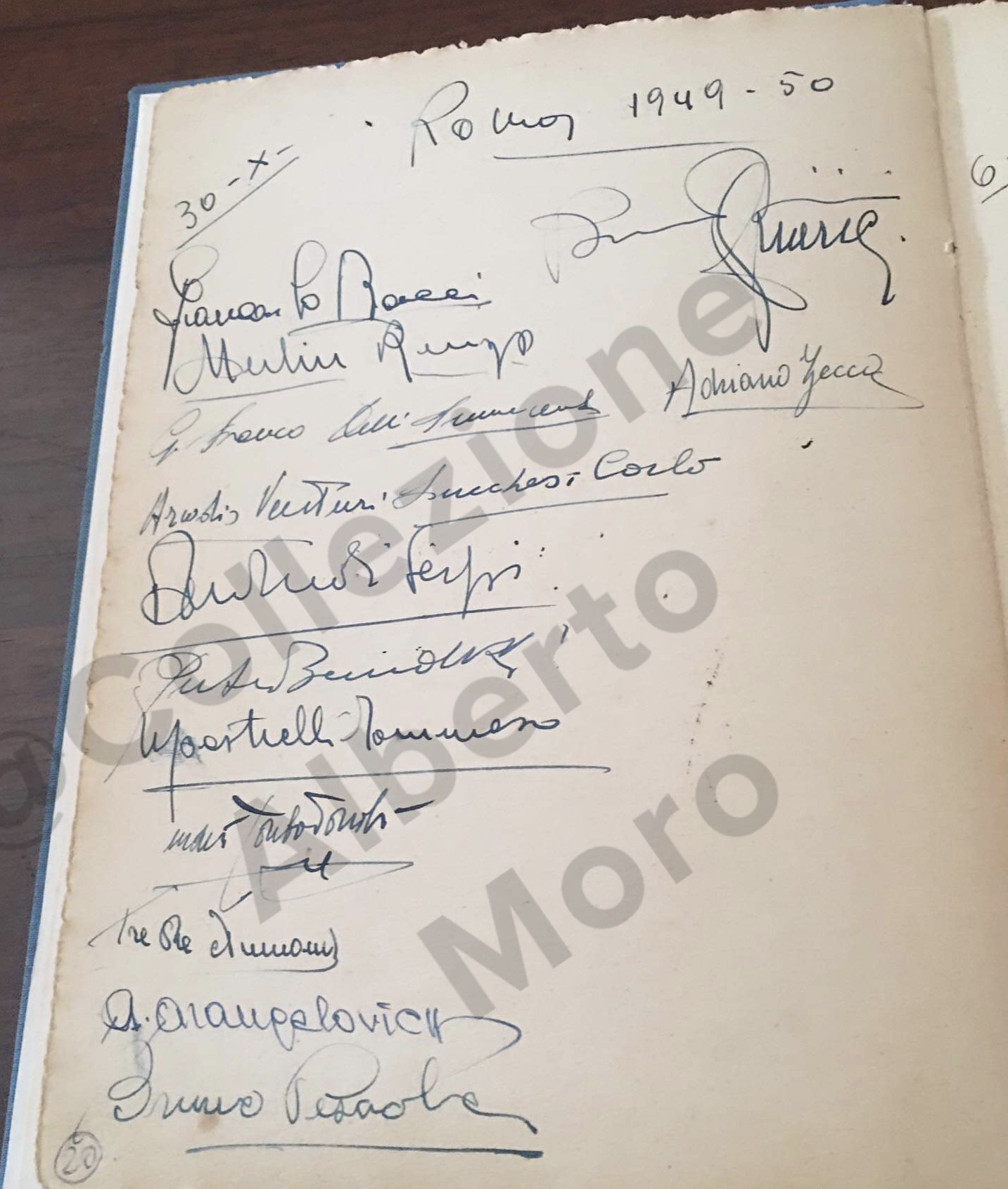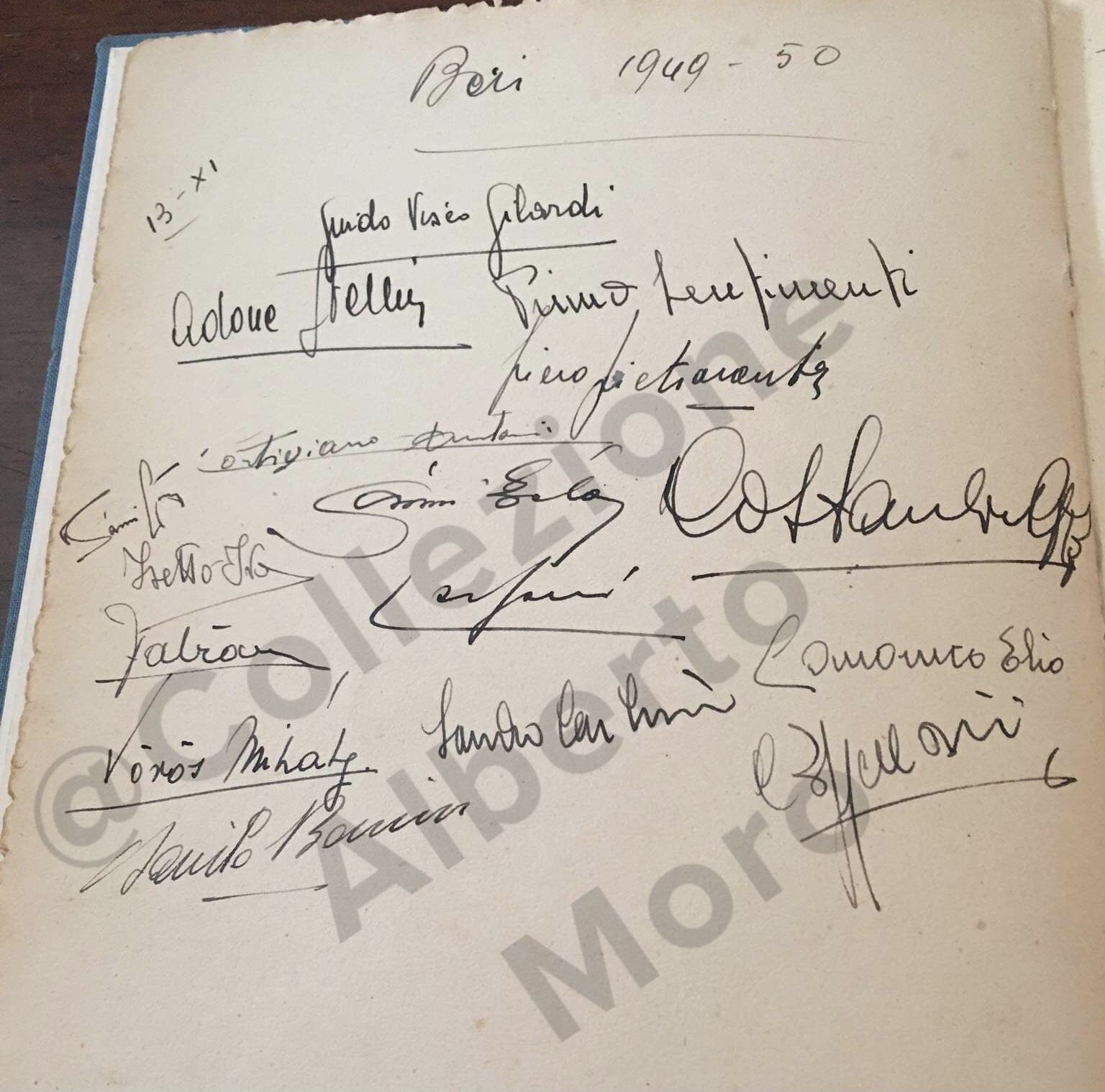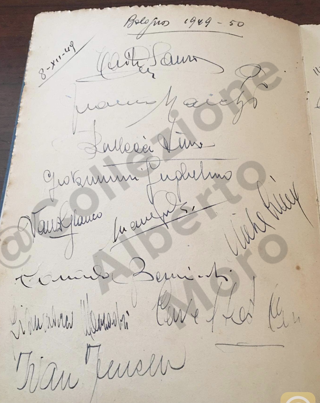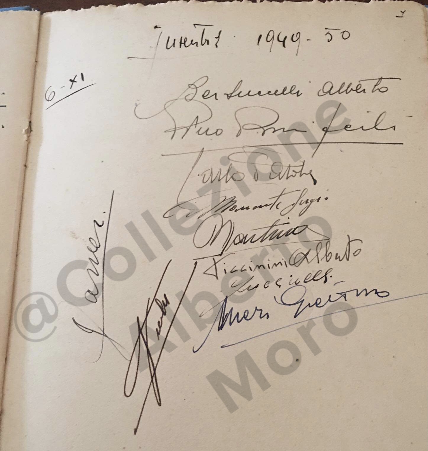 Beh un quaderno fantastico… con gli autografi impressionanti … i calciatori della nazionale inglese del ’49, la Roma del 1953 in tournee a Caracas, ma anche Corinthias, Barcellona, Caracas, Cecoslovacchia, Svizzera, Austria, Fiorentina, Bologna, Inter, Venezia, Padova, Pro Patria, Lucchese, Torino, Milan, Sampdoria, Triestina, Atalanta, Lazio, Palermo, Juventus, Roma. Firme quali quelle di Meazza e Zamora… beh cercate voi di capire le altre a chi si riferiscono…