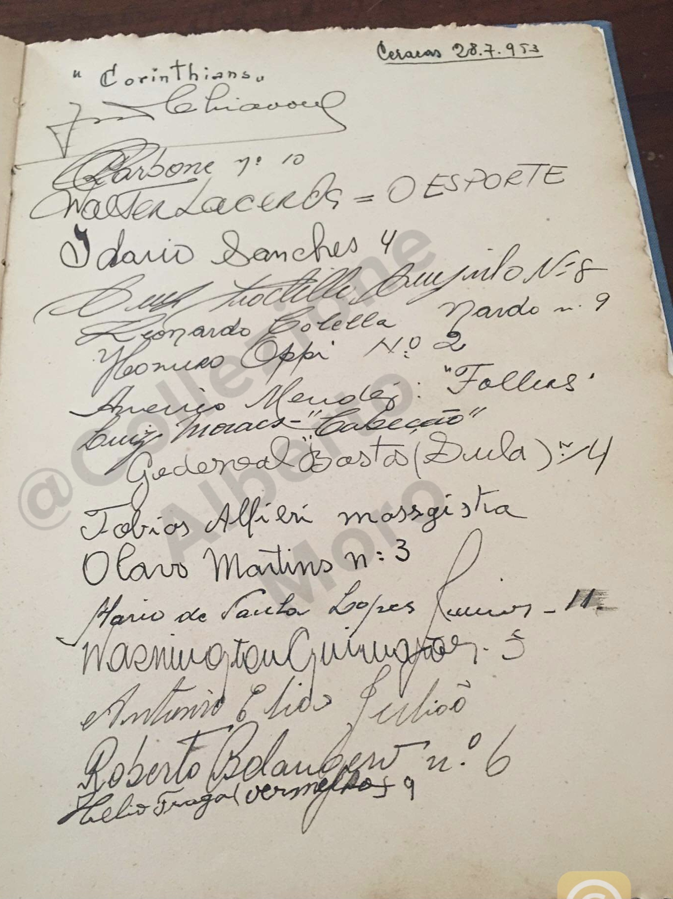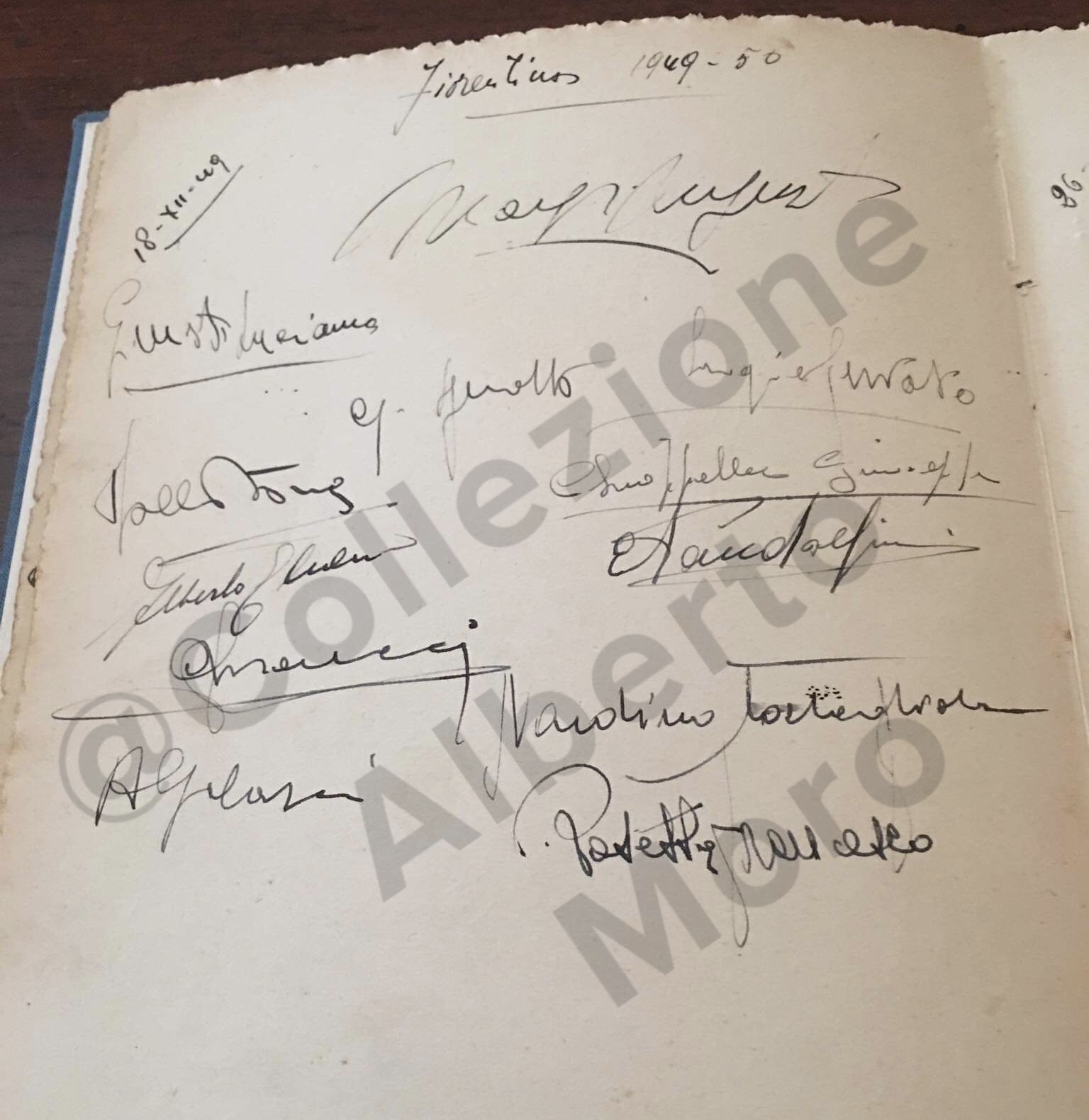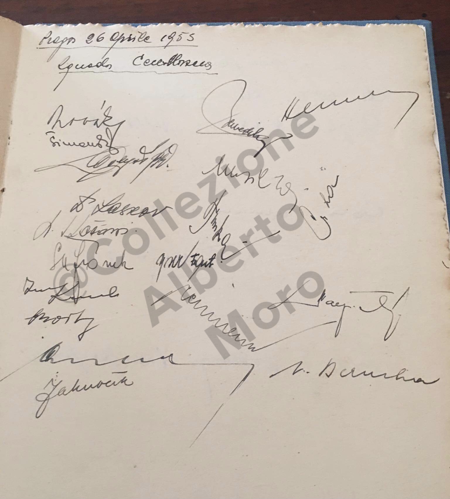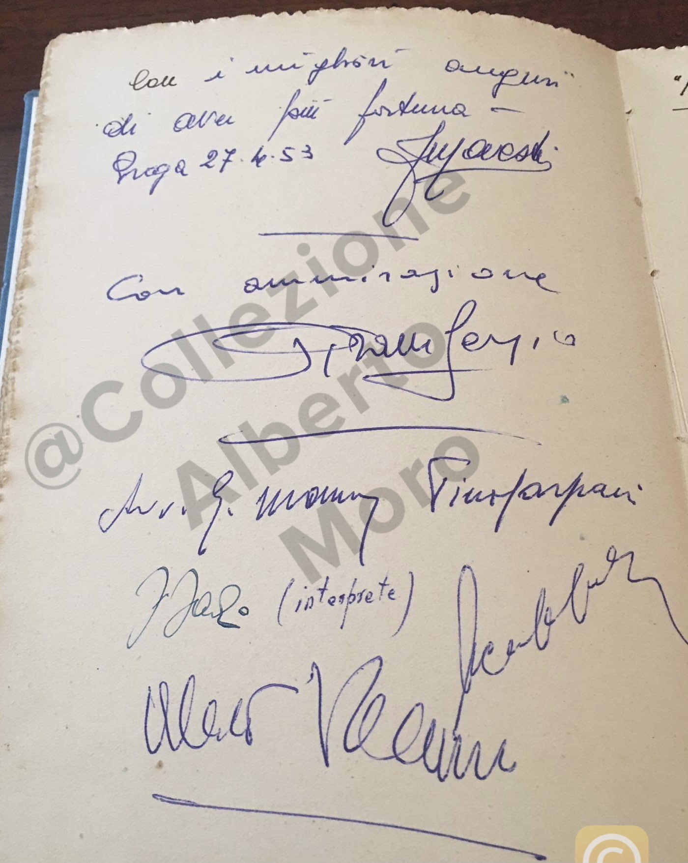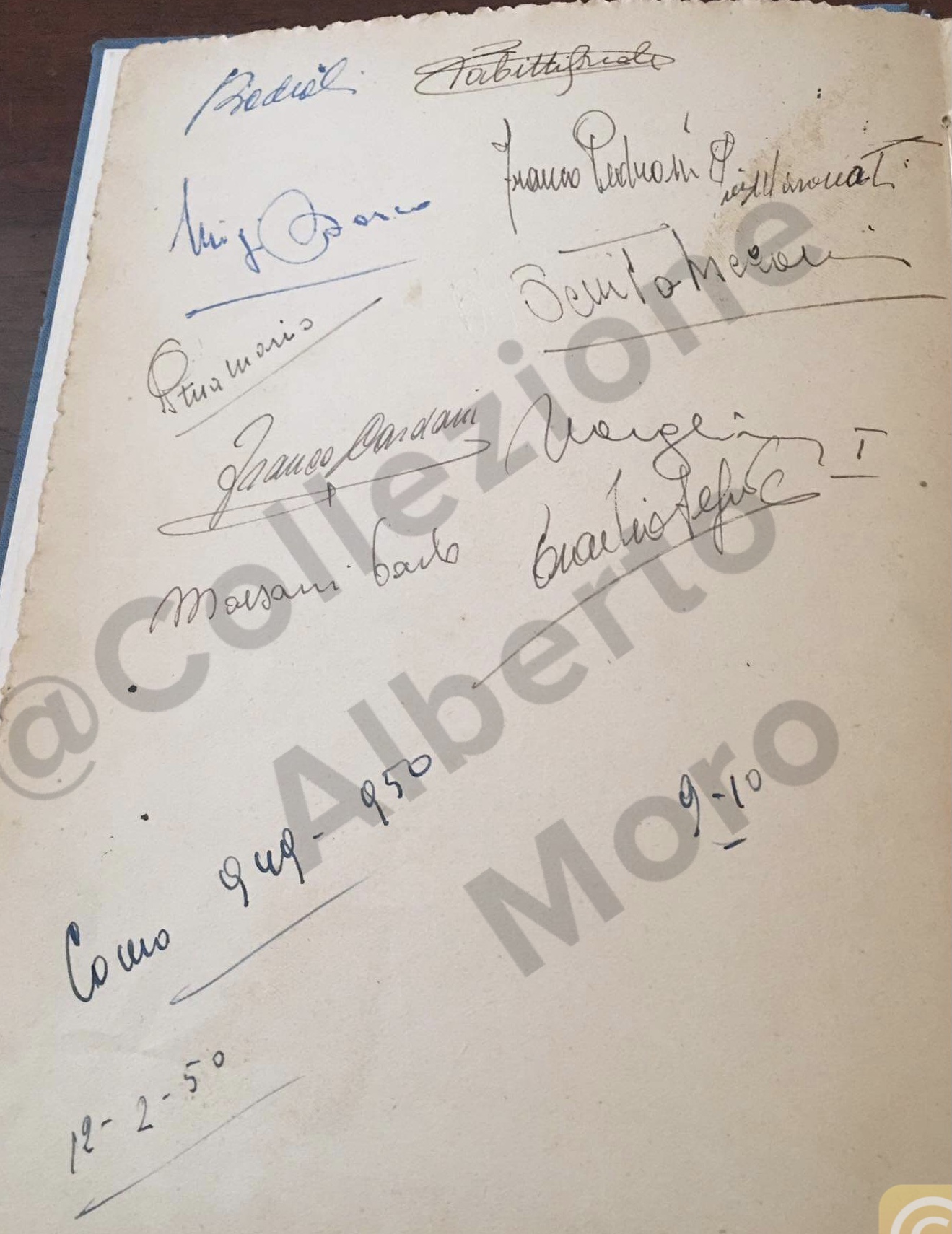 Beh un quaderno fantastico… con gli autografi impressionanti … i calciatori della nazionale inglese del ’49, la Roma del 1953 in tournee a Caracas, ma anche Corinthias, Barcellona, Caracas, Cecoslovacchia, Svizzera, Austria, Fiorentina, Bologna, Inter, Venezia, Padova, Pro Patria, Lucchese, Torino, Milan, Sampdoria, Triestina, Atalanta, Lazio, Palermo, Juventus, Roma. Firme quali quelle di Meazza e Zamora… beh cercate voi di capire le altre a chi si riferiscono…