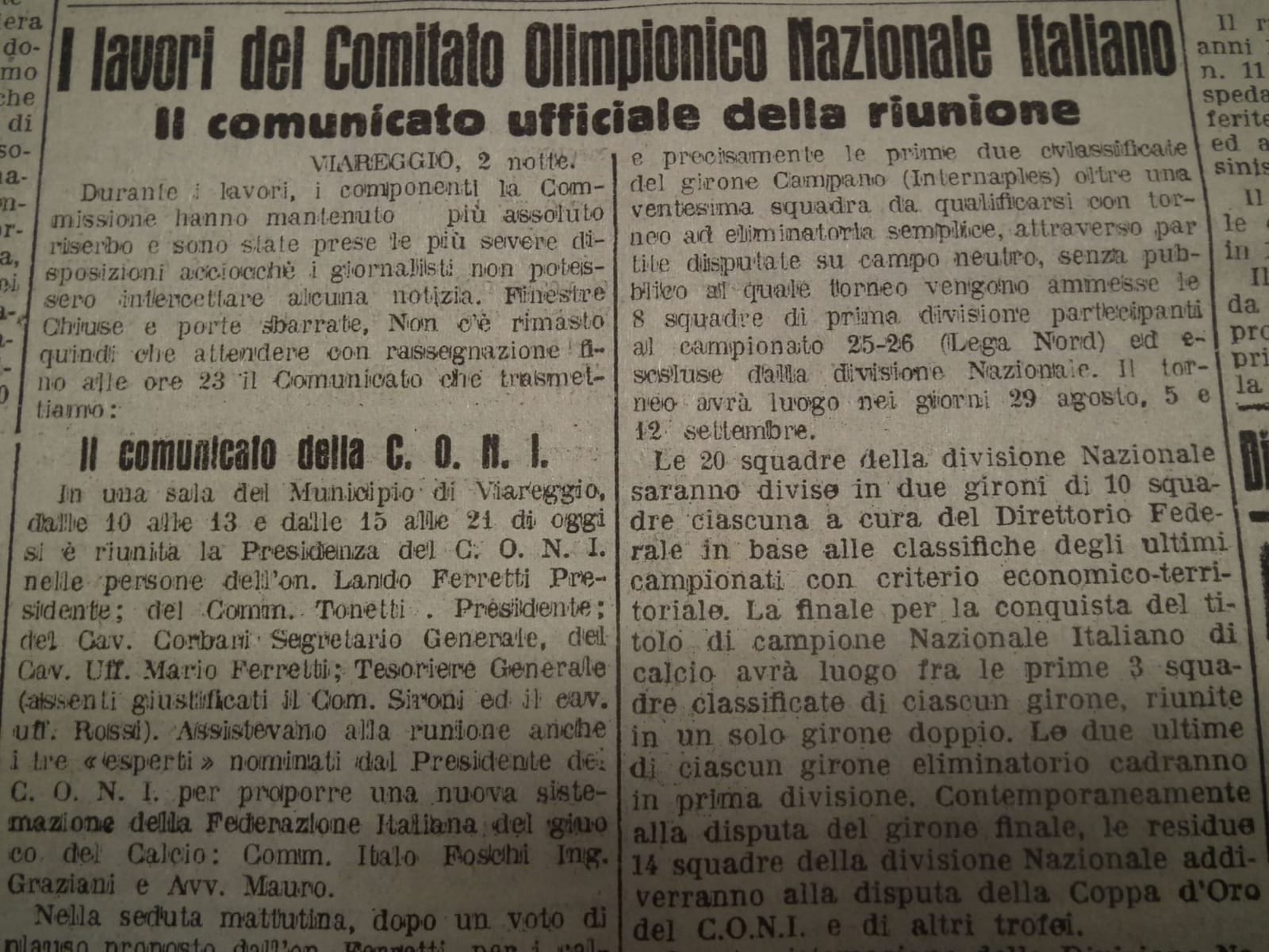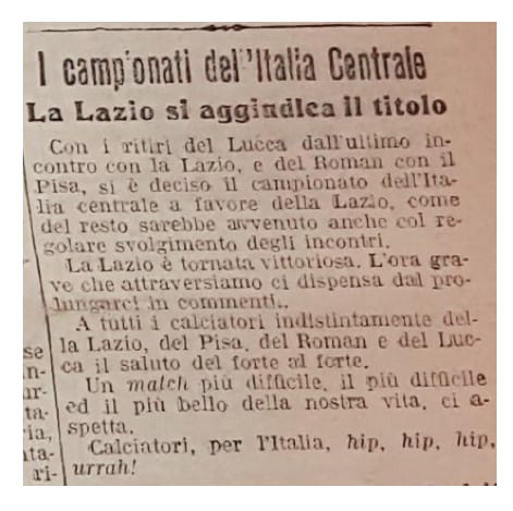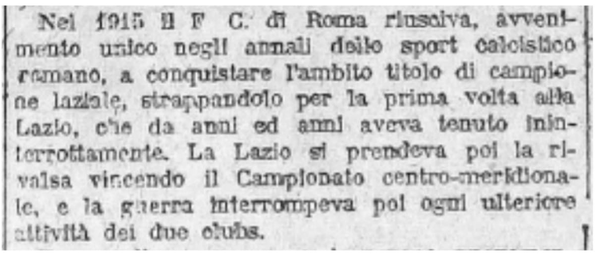 Nelle edizioni successive, edite fino al 1932, il novellato Albo d’oro viceversa riporta che il Campionato 1914/15 risulta “aggiudicato al Genoa”, senza che tuttavia vi sia alcun riscontro nell’ampio resoconto storico sulle attività e sulle delibere federali dettagliate in tali pubblicazioni a partire sin dalla fondazione stessa della Federcalcio. Forse è solo una coincidenza, ma non vorrei che in quegli anni hanno fatto “pagare” alla Lazio la mancata fusione con gli altri club romani che, com’è noto, in forza di “direttive superiori” nell’estate del 1927 ha originato la nascita della Roma. In effetti tutti sanno che Italo Foschi è stato il primo presidente giallorosso, ma pochi ricordano che lo stesso è stato anche uno dei membri del triumvirato della Carta di Viareggio che nel 1926 ha riformato il sistema calcistico “implementando” la fusione dei club delle stesse città centro-meridionali onde renderle maggiormente competitive a livello nazionale.