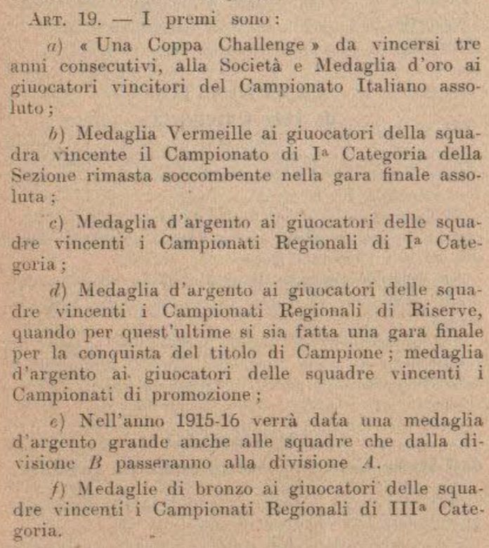 Stiamo parlando di una vicenda molto complessa, sulla quale hanno pesantemente inciso i vari sistemi di potere susseguitisi nel tempo. In realtà le risultanze documentali decisive sono almeno tre, tutte rinvenute presso archivi universitari e/o telematici. Il Regolamento del 1914/15, pubblicato sul Bollettino della Figc dell’epoca, ha chiarito come le stesse fonti ufficiali distinguessero tra campionato italiano e campionato italiano assoluto. Il primo altro non era che il campionato settentrionale, molto più attenzionato dalla stampa nordista del tempo, che probabilmente i poteri istituzionali, a tinte fortemente rossoblù, hanno assegnato d’ufficio al Genoa nell’ambito dello scisma federale del 1921 e che poi è stato strumentalizzato e/o quantomeno equivocato fino ad oggi.