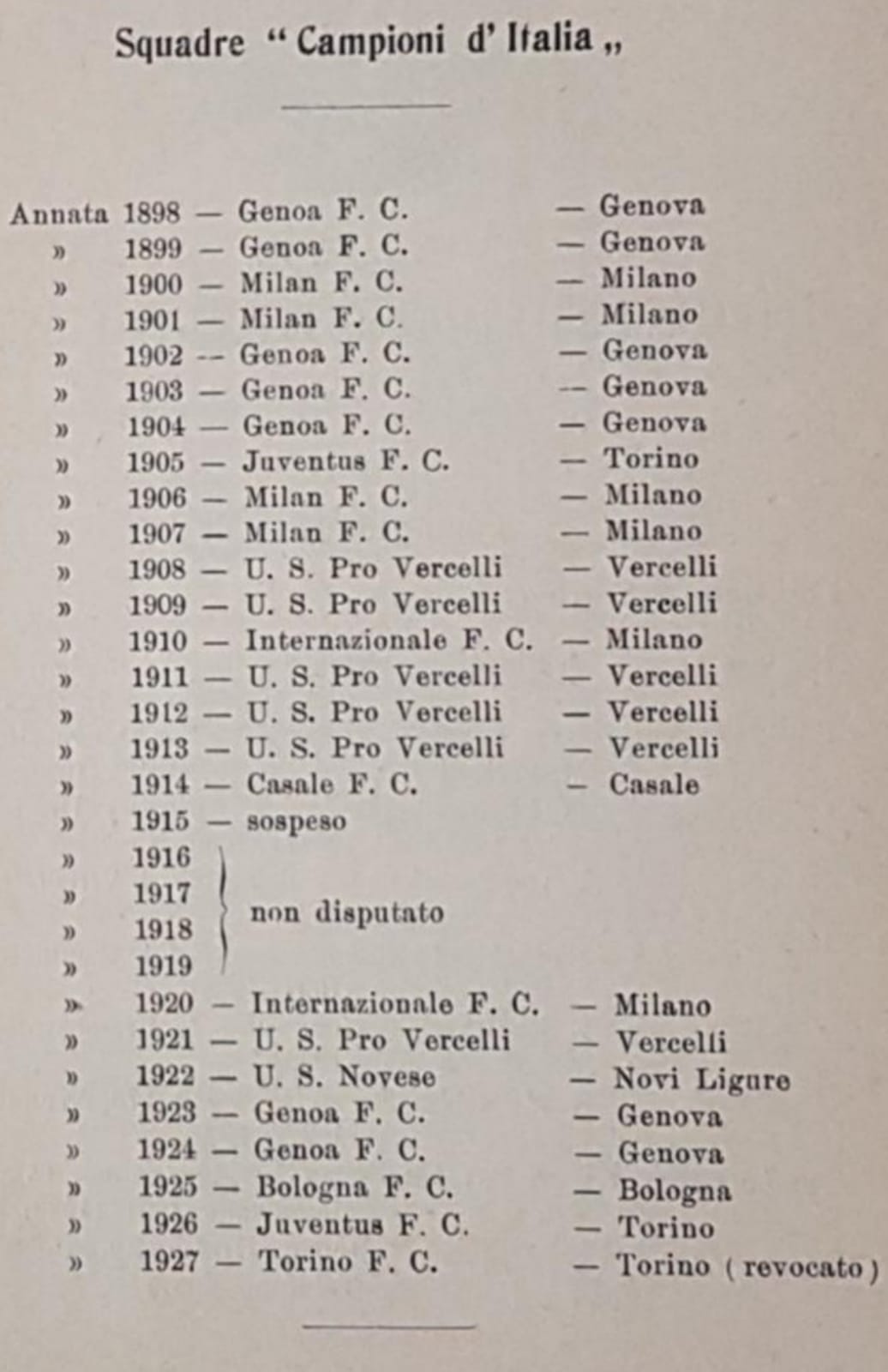 Nell’edizione del 1926-1927 l’Albo d’oro classifica ancora il Campionato 1914/15 “sospeso”, il che smentisce categoricamente la tesi genoana secondo cui lo Scudetto 1915 sarebbe stato definitivamente attribuito ai liguri a maggio 1921.