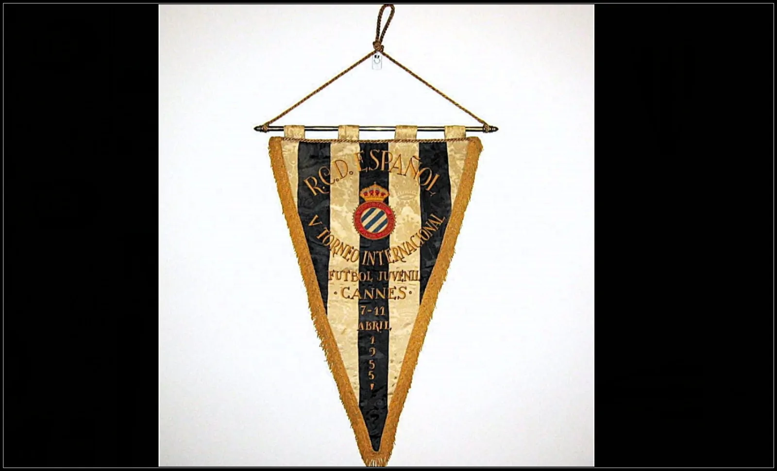 In occasione del torneo giovanile di Cannes del 1955, disputato su un format costituito da due gironi ciascuno con quattro rappresentative giovanili U-18 di club europei, l’Espanyol utilizzò un gagliardetto particolare e davvero raro se comparato con la tradizionale produzione spagnola dell’epoca.