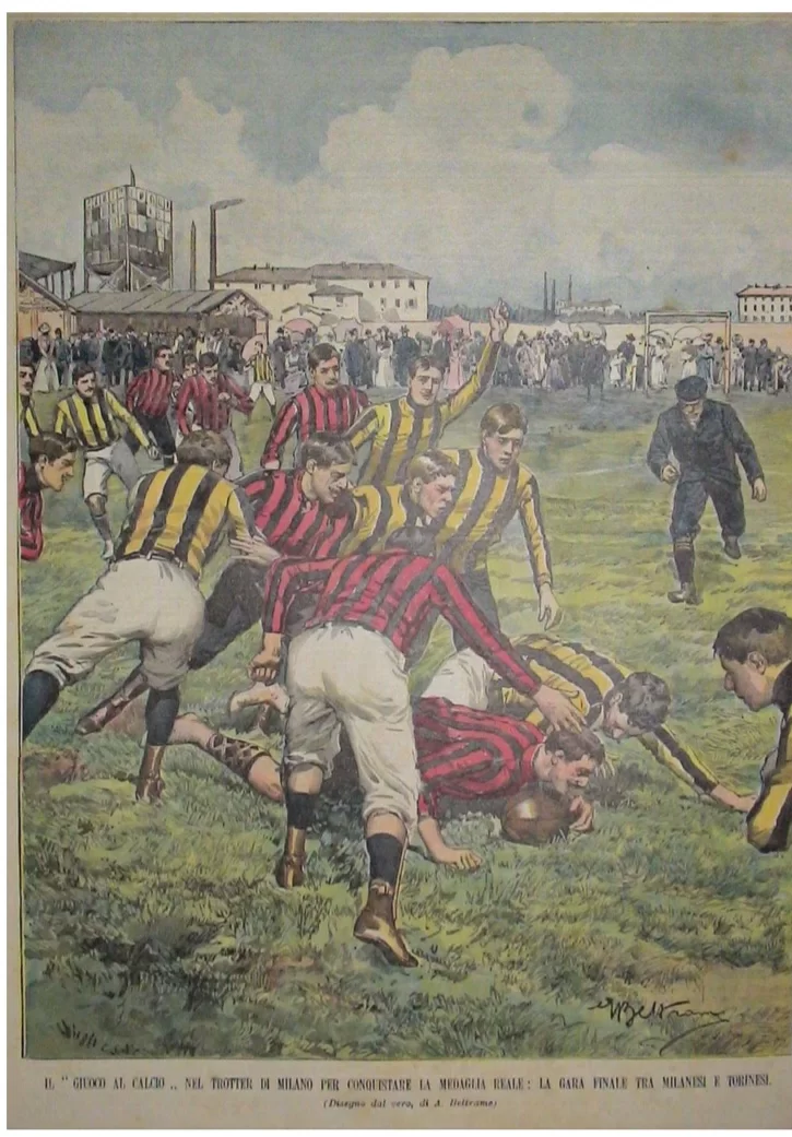Anche se il gioco con le mani fu vietato, era tuttavia ancora facile confondere i due sport, già popolarissimi sul finire dell’Ottocento; ciò è confermato da diverse raffigurazioni artistiche dell’epoca prodotte in Inghilterra, nelle quali scene di football mostrano nutrite mischie di persone che si contendono un pallone, talvolta ovale, sia con le mani che con i piedi; e buona parte dei giocatori sono raffigurati a terra, perfino calpestati! Nella fig. A.9 abbiamo la prima illustrazione calcistica apparsa su un quotidiano italiano: è uno dei primissimi disegni del famoso illustratore Beltrame, eseguito dal vivo durante una partita di calcio a Milano nel 1902.