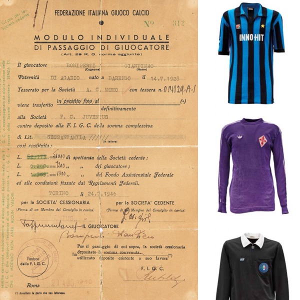 “Questa terza asta è un logico proseguimento del cammino intrapreso tre anni or sono” ci dice Bolaffi, “Nella prima ci ritrovammo a sfruttare alcune circostanze contingenti che ci avevano portato, ai margini di una trattativa molto diversa, allo Statuto di fondazione del Milan del 1900. Riuscimmo a predisporre la prima vendita all’incanto del genere in Italia ma con pochi “pezzi” tra cui, oltre al già citato Statuto, la maglia di Gigi Riva dello storico scudetto sardo, la maglia di Zoff della stagione 1977/78. L’asta, che comunque fu un gran successo, conteneva una ventina di lotti circa: andarono tutti venduti. A quel punto ci abbiamo creduto e abbiamo pensato di continuare con la seconda asta lo scorso anno: 83 lotti, tra cui una collezione di gagliardetti appartenuti all’arbitro Daniele Tombolini, la maglia di Saadi Gheddafi, figlio del dittatore libico, alcune maglie appartenute ad Andrea Agostinelli, ex giocatore della Lazio e non solo, tra cui una maglia di Maradona. Inoltre anche la maglia di Riva dei “Mondiali” del 1974 e i guanti di Dino Zoff utilizzati durante il Mundial vincente di Spagna ’82, oltre alla splendida maglia del Brasile di Pelè indossata nel 1971. Insomma fu qualcosa di più strutturato rispetto alla prima. L’asta attuale, come poc’anzi detto, è l’asta del consolidamento, delle certezze ma anche delle speranze. Un campo in cui abbiamo investito creando un apposito dipartimento strutturato e con un responsabile. Insomma una sola asta annuale, al momento, ma scadenzata e nota al mercato e per la quale si lavora costantemente. Pian piano ci stiamo creando la nostra autorevolezza in questo settore e le persone ci contattano sempre più per affidarci le loro collezioni. Abbiamo infatti valutato nel corso di quest’ultimo anno molti più oggetti. Ovviamente, come anche negli altri settori, abbiamo svolto una cernita importante scartando oggetti non degni o di dubbia provenienza, oppure perché abbiamo ritenuto che non avessero “dignità collezionistica” o semplicemente erano rovinati o danneggiati. Insomma noi eseguiamo costantemente delle valutazioni in ambito qualità e autenticità. Poi capita anche che gli oggetti rispettino tutti gli standard da noi ritenuti imprescindibili ma semplicemente poi non si trovano gli accordi con i relativi proprietari. In questa asta proponiamo oltre 200 lotti composti da una grande varietà di oggetti”. Qui la voce di Filippo Bolaffi assume un tono pregno di soddisfazione… “Abbiamo tra i nostri lotti il contratto, il primo da professionista, di un giovanissimo Boniperti, ceduto alla società F.C. Juventus dal club dilettantistico A.C. Momo, con le firme autografe del giocatore, dei rappresentanti dei due club e della F.I.G.C. Il contratto presenta due curiosi errori di battitura, uno sul nome di battesimo, Gianpiero anziché Giampiero, e l’altro sulla data di nascita, 14 luglio, anziché 4 luglio. Un documento che definirei romantico, di un calcio ormai purtroppo troppo lontano. Inoltre è presente anche una pittura ad olio di Gigi Meroni, grande genio calcistico del Torino. Il calciatore era famoso per la sua eccentricità fuori dal campo espressa anche con la pittura. Il quadro viene venduto accompagnato da numerose fotografie di Meroni nella sua vita privata e non, tra cui una con la sua famosa “gallina da passeggio”. Inoltre abbiamo importanti “pezzi” della Juventus anni ‘80 come la maglia di Michael Laudrup nella rara versione gialloblu, la maglia indossata da Gaetano Scirea nella stagione 1985/86 e la maglia di Platini della stagione 1984-85. Siamo poi entrati in possesso di una selezione di maglie del giocatore degli anni ‘60 Mario Trebbi, come quella del Benfica indossata dal difensore Raul Machado durante la finale della Coppa dei Campioni 1962-63 contro il Milan e scambiata proprio con Trebbi a fine gara. Un pezzo da Museo. Stessa provenienza per la maglia Crylor della Società Sportiva Monza 1912, rossa con banda bianca verticale e stemma del club, indossata da Mario Trebbi durante le stagioni 1969-73. Inoltre anche la seconda maglia del Napoli indossata da Maradona, nell’unica volta della sua carriera in cui giocò con il numero 9, avendo in quell’occasione ceduto la sua 10 all’erede designato, un giovanissimo Gianfranco Zola. Presenti anche altri cimeli quali fotografie autografate, programmi ufficiali e svariate maglie delle nazionali, tra cui alcune dell’Italia come quella di Albertosi”.