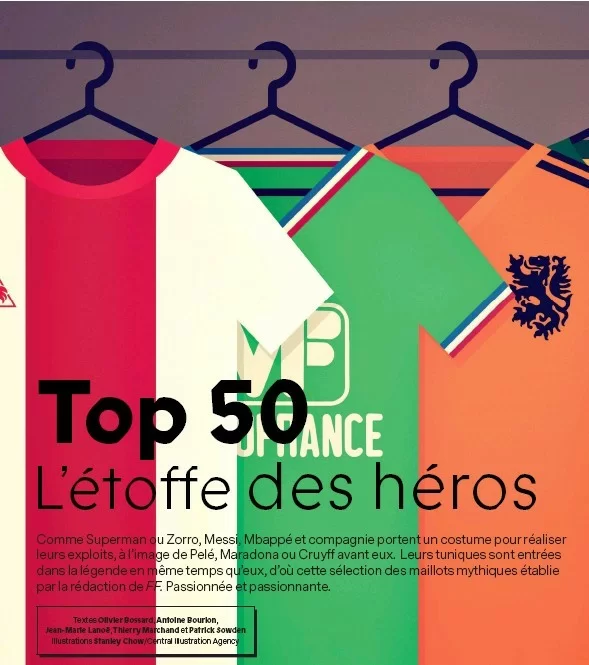 “Come Superman o Zorro, Messi, Mbappé e compagni indossano un costume per portare a termine le loro imprese, come Pelé, Maradona o Cruyff prima di loro. Le loro tuniche sono entrate nella leggenda contemporaneamente a loro, da qui questa selezione di maglie mitiche stabilite dalla redazione di FF. Appassionato ed eccitante”.