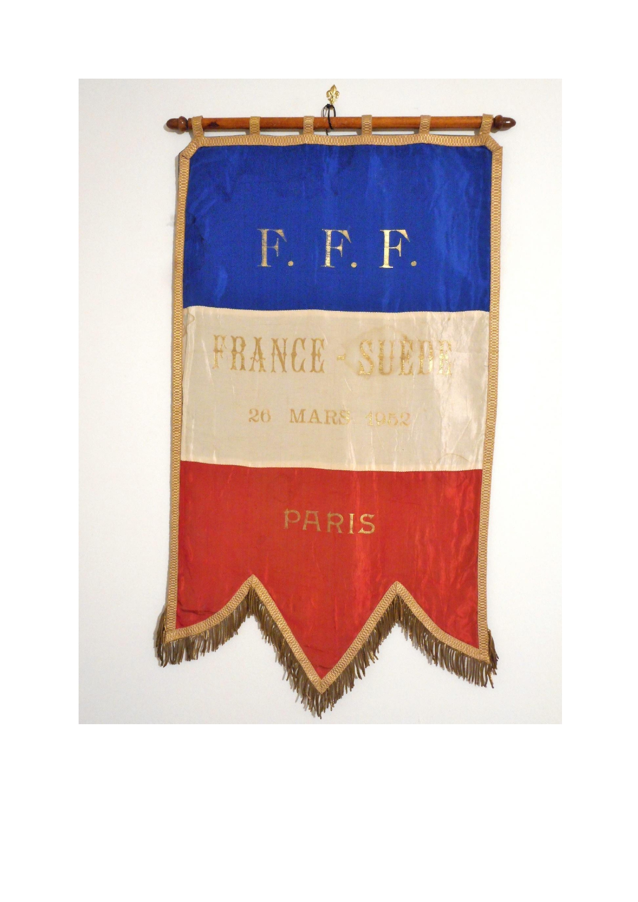 Nella notte di Parigi questo esemplare, nella sua bellezza, segnava tuttavia un declino in stile poiché la preziosa fattura dei gagliardetti ricamati veniva abbandonata a favore dell’utilizzo della stampa per riportare i dettagli dell’incontro. Il segno del tempo che cambia e che portò poi la nazionale francese, da lì a pochi anni, a cambiare i propri gagliardetti inserendo nelle proprie insegne il “galletto” già presente sulle maglie e riducendo lo stile a labaro a quello più contenuto di formato triangolare.
