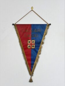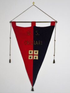 Relativamente ai gagliardetti, nel periodo compreso tra gli anni cinquanta e settanta vengono realizzati, solitamente, ricamati a mano con sfondo rosso e blu e stemma dei quattro mori.