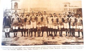 Due immagini danno testimonianza sui saluti precedenti l’incontro e sui rispettivi gagliardetti/labari. Nella prima è significativo evidenziare come il nostro capitano, prima dello scambio dei rispettivi vessilli, saluti il C.T. Hugo Meisl (di spalle nella foto). Nella seconda immagine, invece, il gagliardetto azzurro è tra le mani del nostro C.T. Meazza, segno evidente che non era ancora diffusa la consuetudine che a tenere, oltre che scambiare il gagliardetto, fosse il capitano. E a proposito del capitano Virgilio Fossati un altro aneddoto che lega le sorti sportive con quelle della Grande Guerra. Nel 1915, dopo aver giocato ulteriori quattro gare in azzurro, Fossati (giocatore dell’Inter) rispose alla chiamata alle armi e partì per il fronte. Non tornò più a casa poiché morì, in maniera eroica, sul Carso nel 1916 meritando la Medaglia d’Argento al Valor Militare.