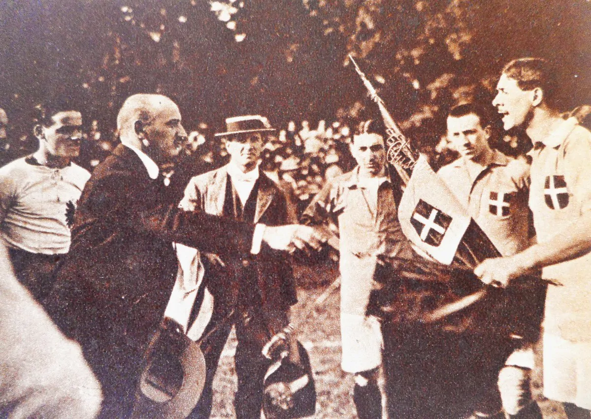 Due immagini danno testimonianza sui saluti precedenti l’incontro e sui rispettivi gagliardetti/labari. Nella prima è significativo evidenziare come il nostro capitano, prima dello scambio dei rispettivi vessilli, saluti il C.T. Hugo Meisl (di spalle nella foto). Nella seconda immagine, invece, il gagliardetto azzurro è tra le mani del nostro C.T. Meazza, segno evidente che non era ancora diffusa la consuetudine che a tenere, oltre che scambiare il gagliardetto, fosse il capitano. E a proposito del capitano Virgilio Fossati un altro aneddoto che lega le sorti sportive con quelle della Grande Guerra. Nel 1915, dopo aver giocato ulteriori quattro gare in azzurro, Fossati (giocatore dell’Inter) rispose alla chiamata alle armi e partì per il fronte. Non tornò più a casa poiché morì, in maniera eroica, sul Carso nel 1916 meritando la Medaglia d’Argento al Valor Militare.