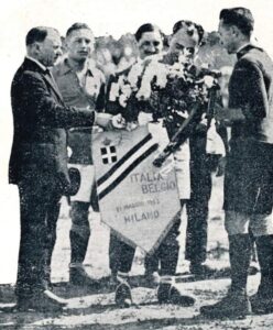 Il definitivo passaggio al gagliardetto si ha qualche settimana dopo l’incontro giocato contro l’Austria, esattamente nella sfida giocata contro il Belgio il 21 maggio del 1922. Un fermo immagine della partita immortala l’attimo della consegna del gagliardetto dell’Italia ritratto sulla fronte. Uno stupendo esemplare, di formato pentagonale, azzurro con fascia trasversale a segnare il confine di due zone ed in particolare quella superiore che riporta lo stemma Savoia sormontato da corona e, nella parte bassa, l’area in cui sono presenti le iscrizioni riguardanti l’incontro. Senza dubbio questo è l’archetipo di gagliardetto che fu utilizzato, con piccole modifiche nella forma, anche negli anni a seguire.