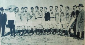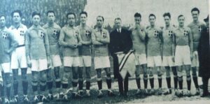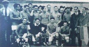 Il 1921 viene inaugurato dall’ennesima partita contro la Francia, un avversario ricorrente per gli azzurri. Si giocò a Marsiglia e l’Italia vinse per 2-1 avviando un’annata prodiga di successi che gli consentirono di incrementare, a livello continentale, la consapevolezza di una squadra oramai ai vertici. Prima dell’inizio della gara gli azzurri si schierano per la foto di rito che, oltre agli undici, vede anche un giovane Vittorio Pozzo nonché l’Ing. Mauro all’epoca commissario della FIGC. Al suo fianco Francesco Calì, il primo capitano degli azzurri nella partita con la Francia nel 1910, che sorregge il labaro realizzato per quell’incontro. Dai reperti fotografici rinvenuti è, verosimile, che in questa la partita, per la prima volta, l’Italia utilizzò un labaro.
