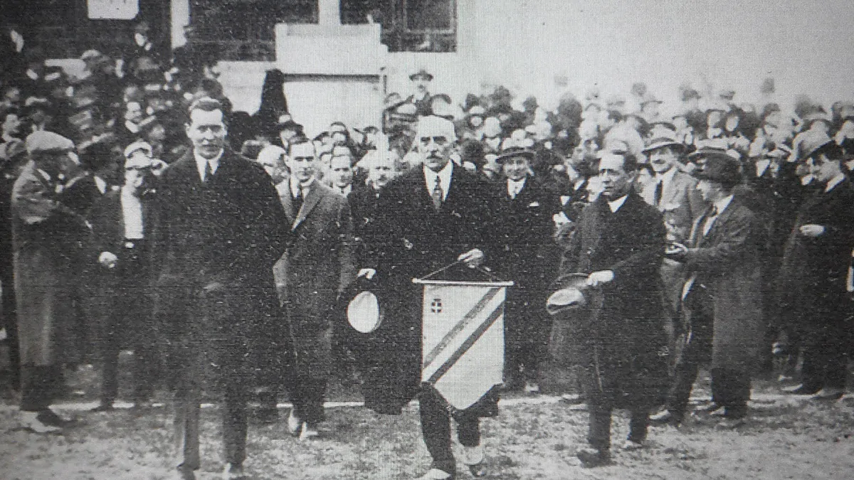 Foto di gruppo con gagliardetti prima di Spagna – Italia giocata il 14 giugno 1925