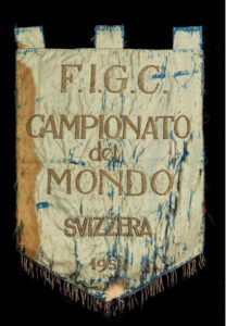 Nel 1953 e nel corso dei mondiali svizzeri del 1954 le cose non cambiarono si continuarono ad utilizzare questa tipologia di gagliardetti. Parallelamente, in occasione dei Campionati del mondo disputati in Svizzera, la Federazione produsse degli esemplari pentagonali nel formato e similari a quelli utilizzati nel 1950 in cui non compariva alcuno stemma ed era presente l’iscrizione della FIGC e dei mondiali. Un gagliardetto di questo tipo, verosimilmente consegnato quale dono dalla Federazione italiana, è stato aggiudicato ad un’asta lo scorso settembre a diverse migliaia di euro.