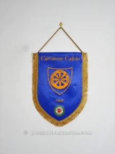 Lo stemma che compare nei gagliardetti della Carrarese è identico all’effige comunale, ossia una ruota riportante il motto “Fortitudo mea in rota” cioè “La mia fortuna è nella ruota”.